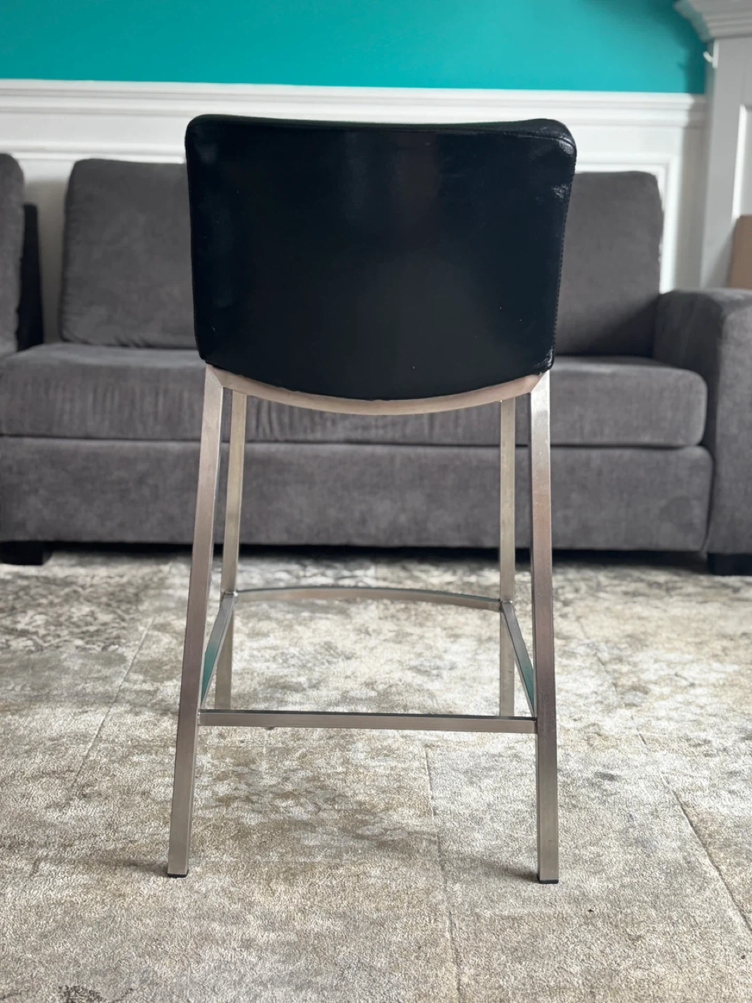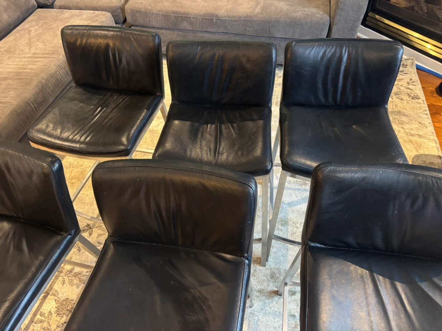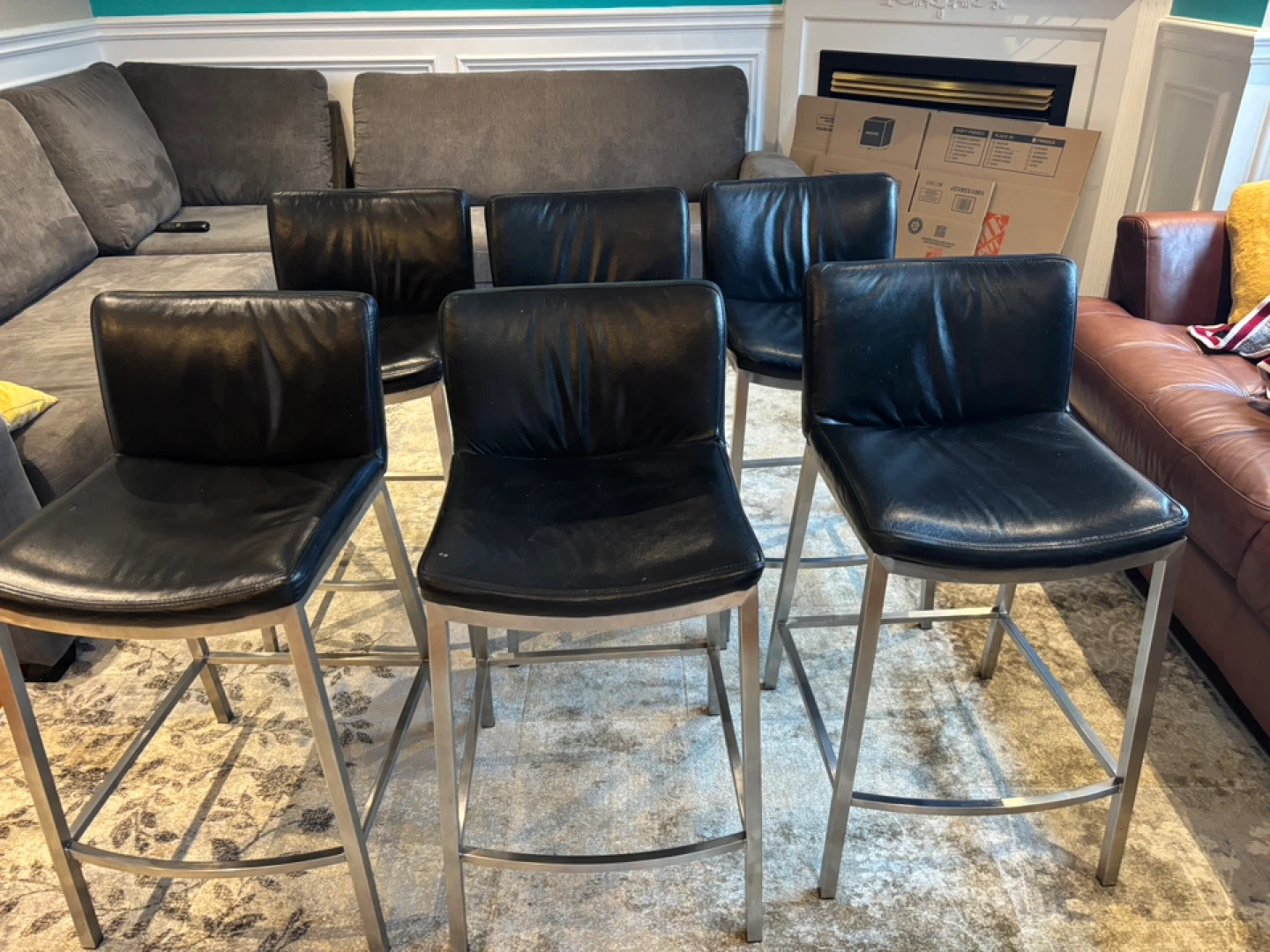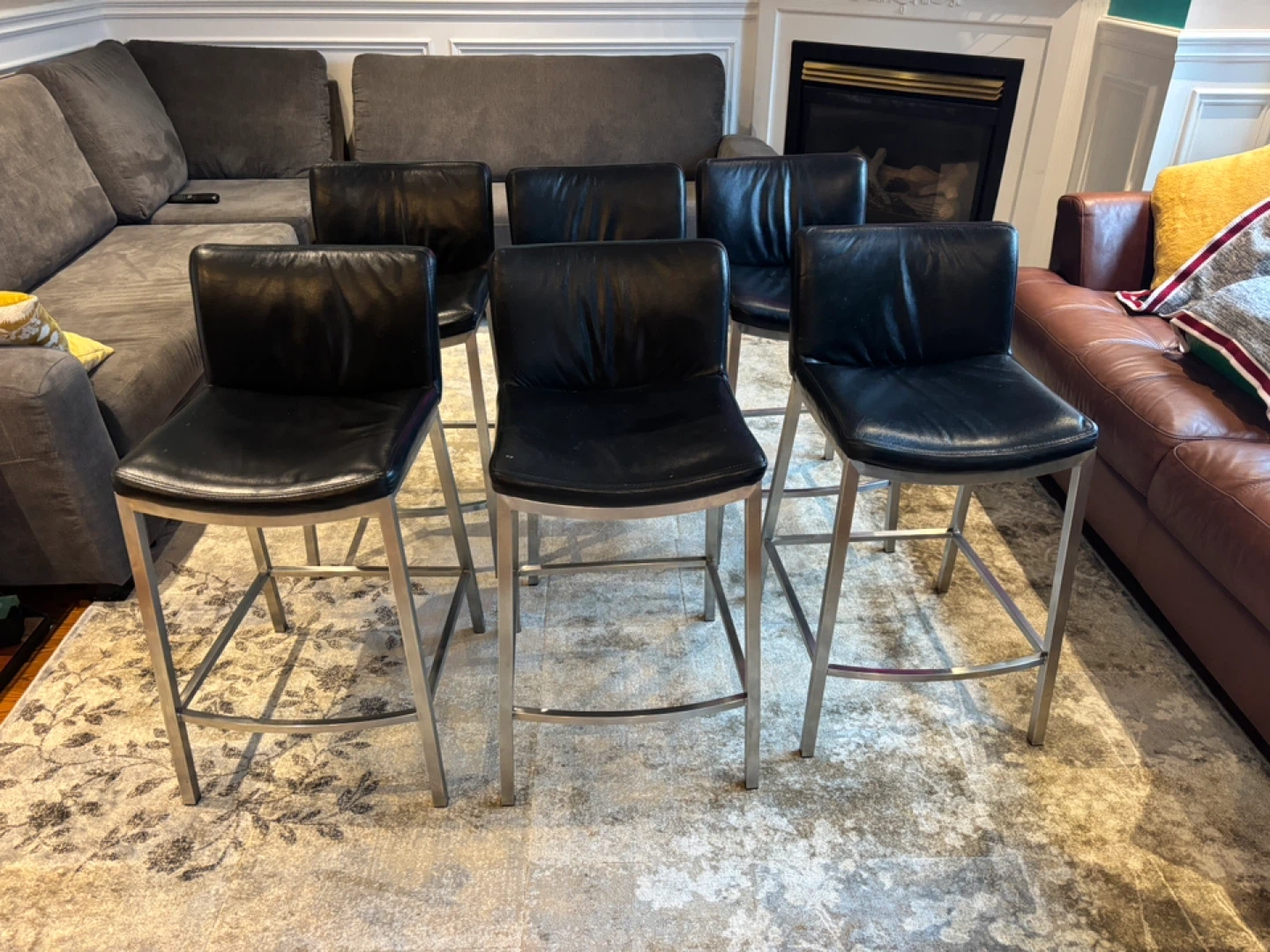 Set of 6 modern counter height bar stools with metal frame and black genuine leather seats throughout .