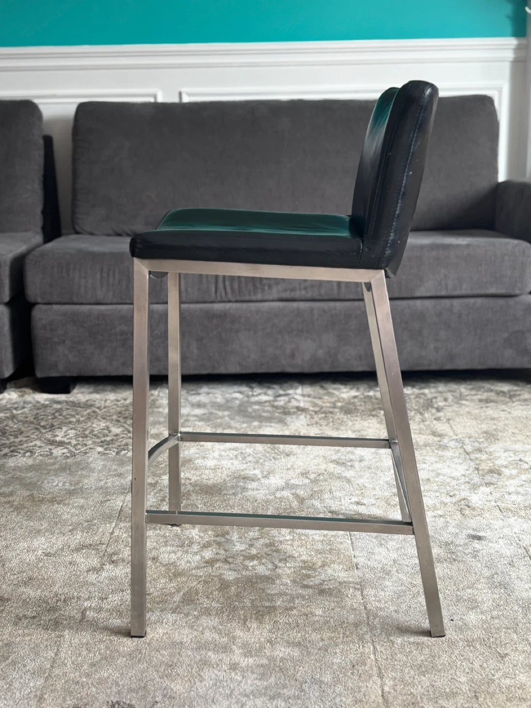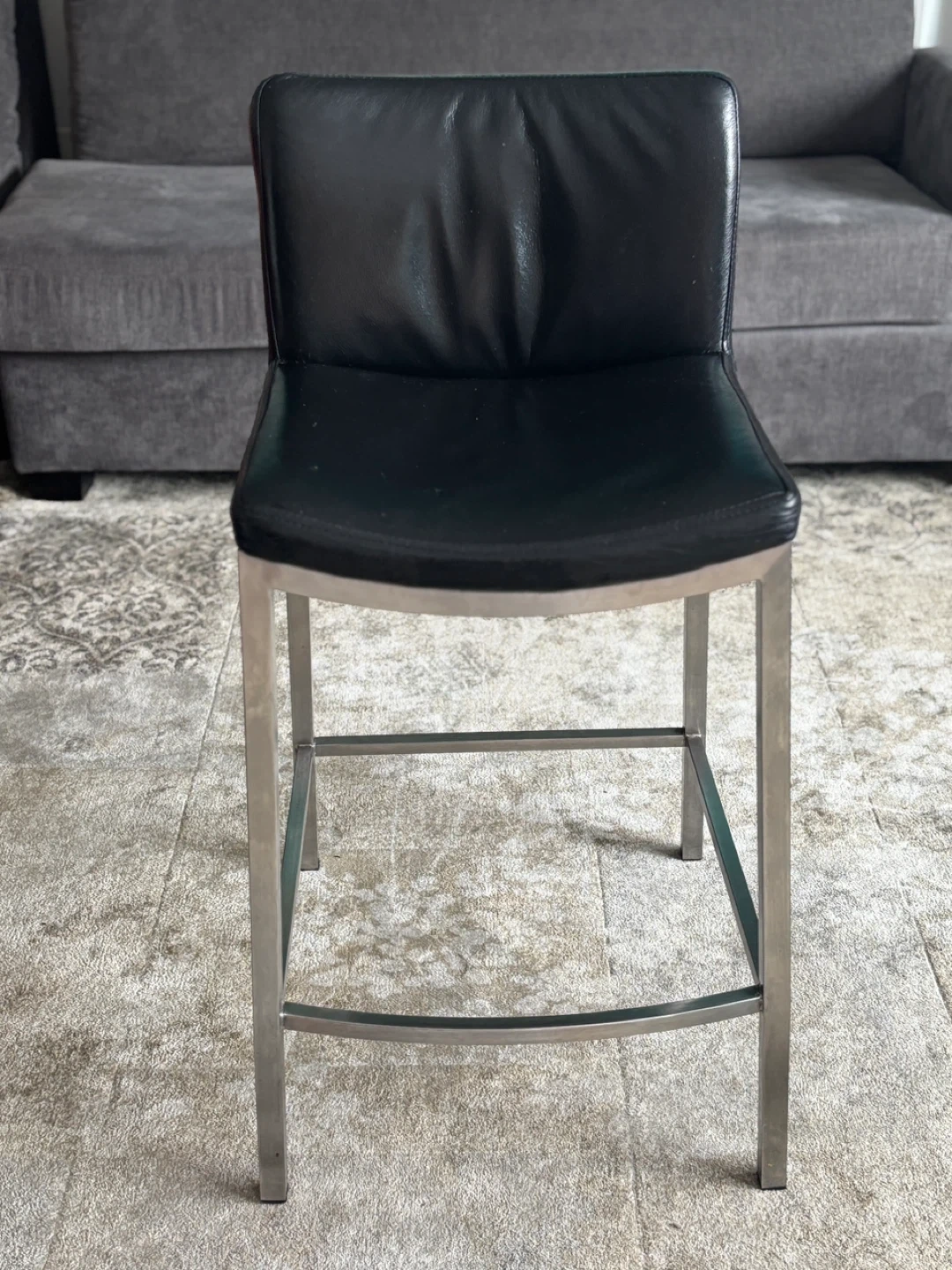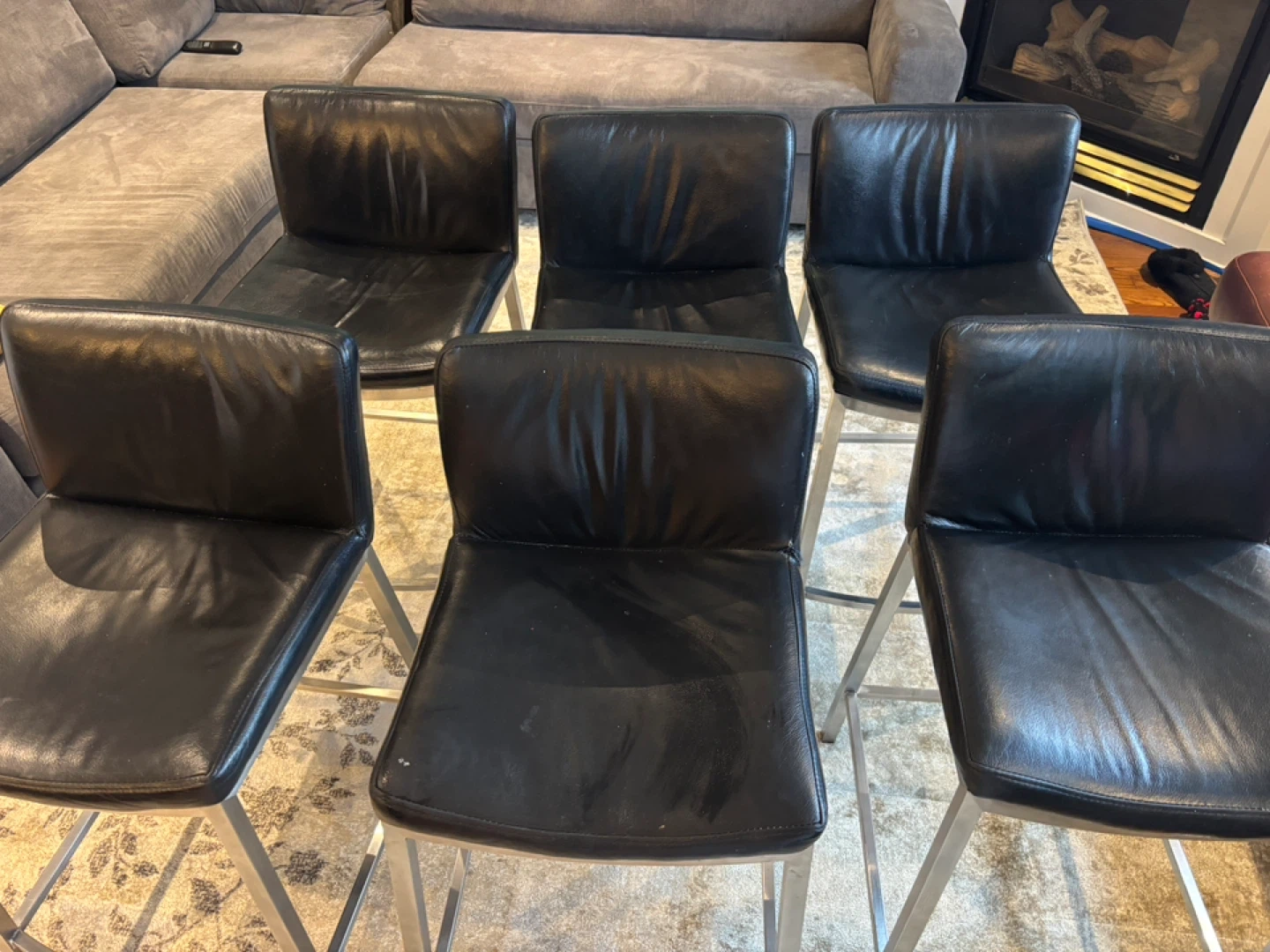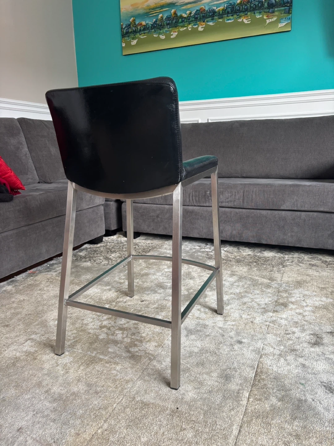 Set of 6 modern counter height bar stools with metal frame and black genuine leather seats throughout .