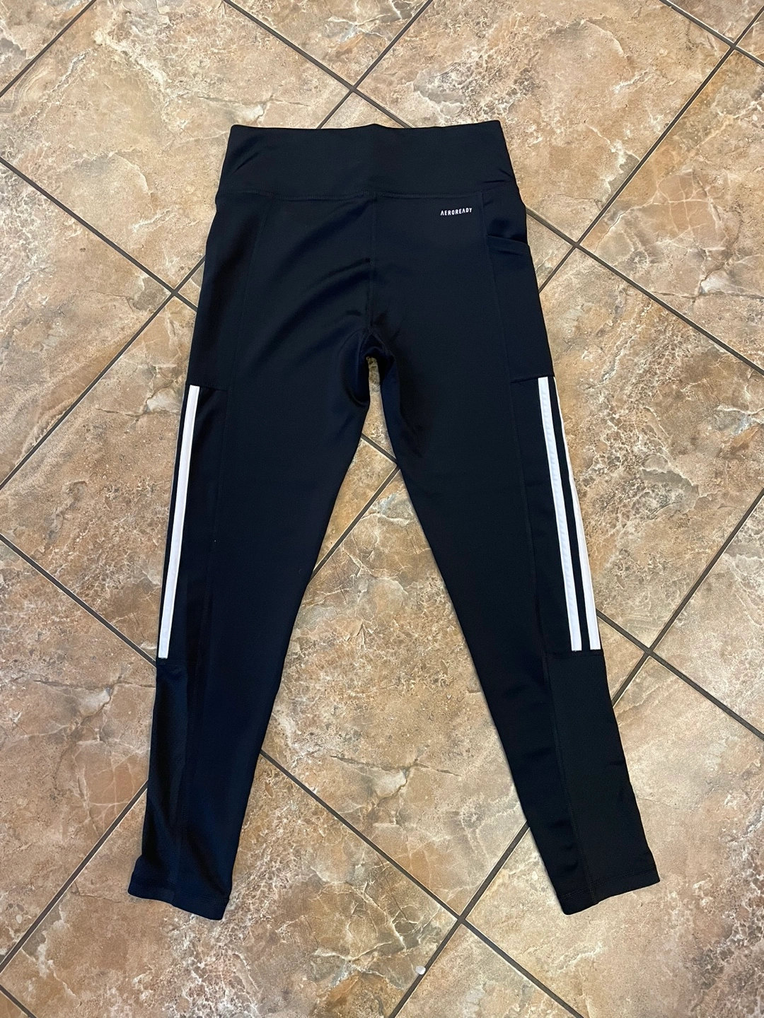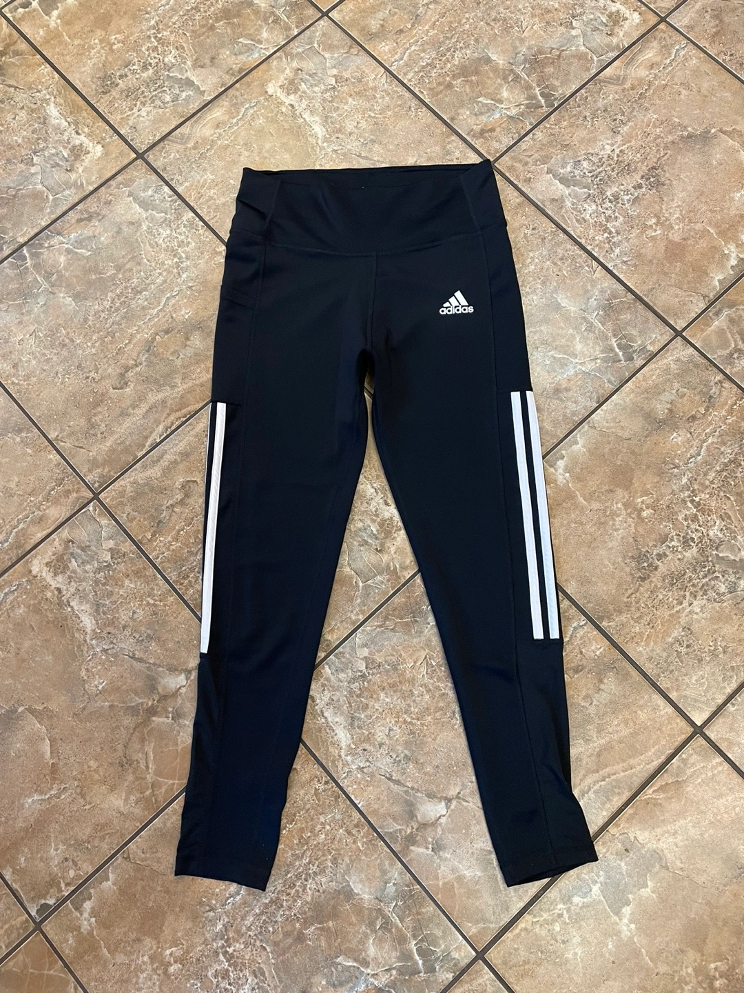 Black running leggings with white stripes on the side and a pocket on the side.