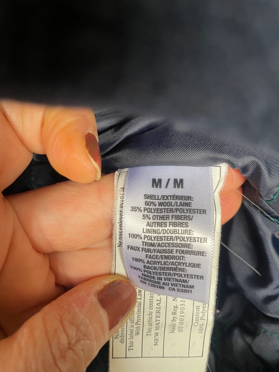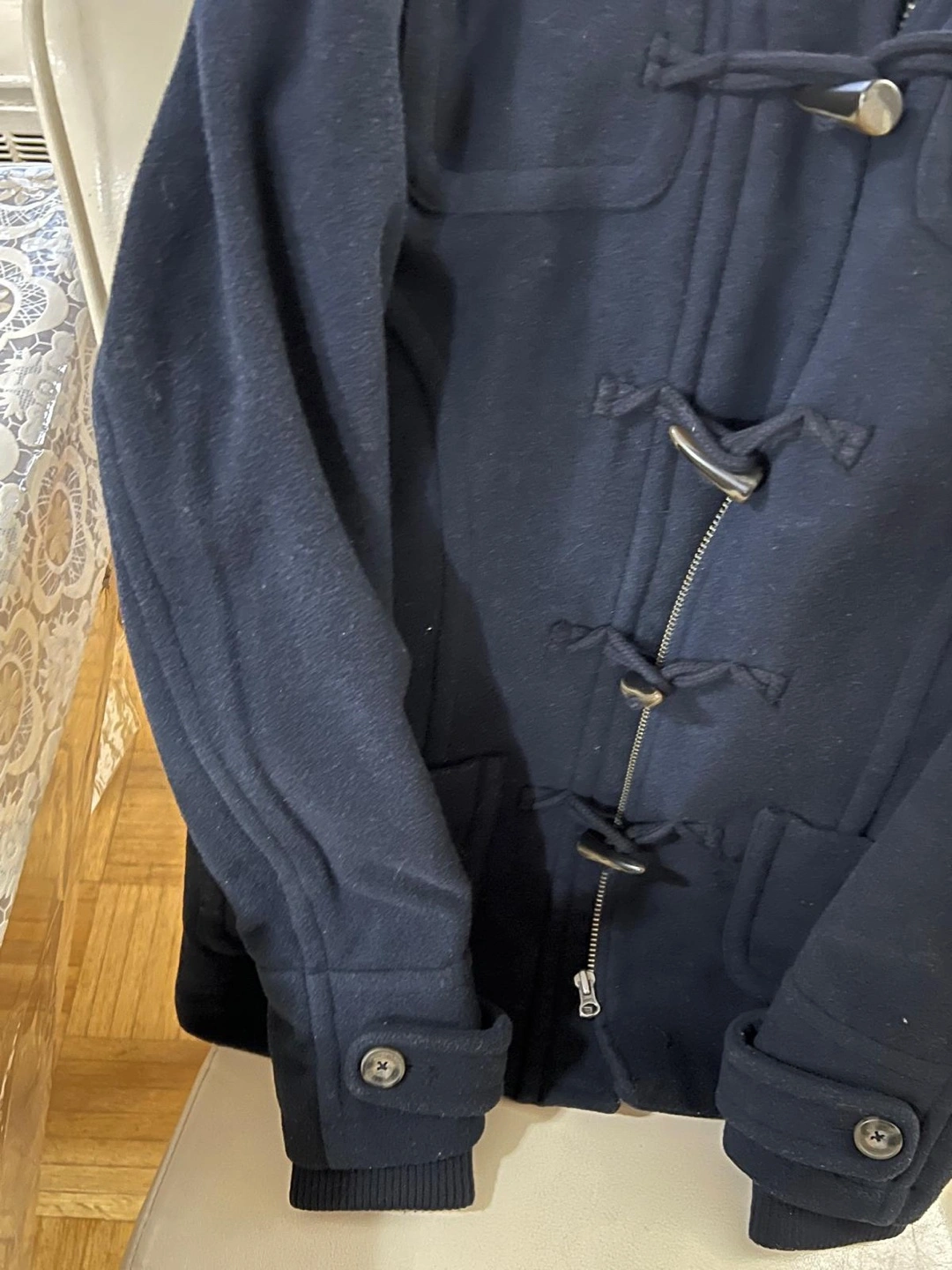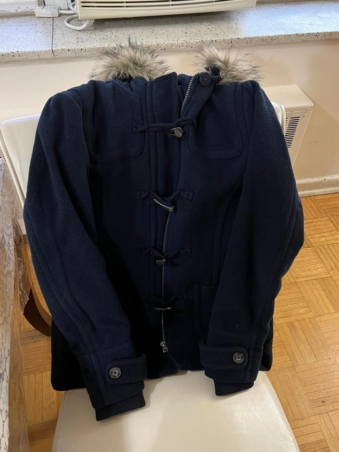 Navy blue peacoat with a faux fur hood. It has a zipper closure with a double-breasted button closure. The coat has pockets and a hood.