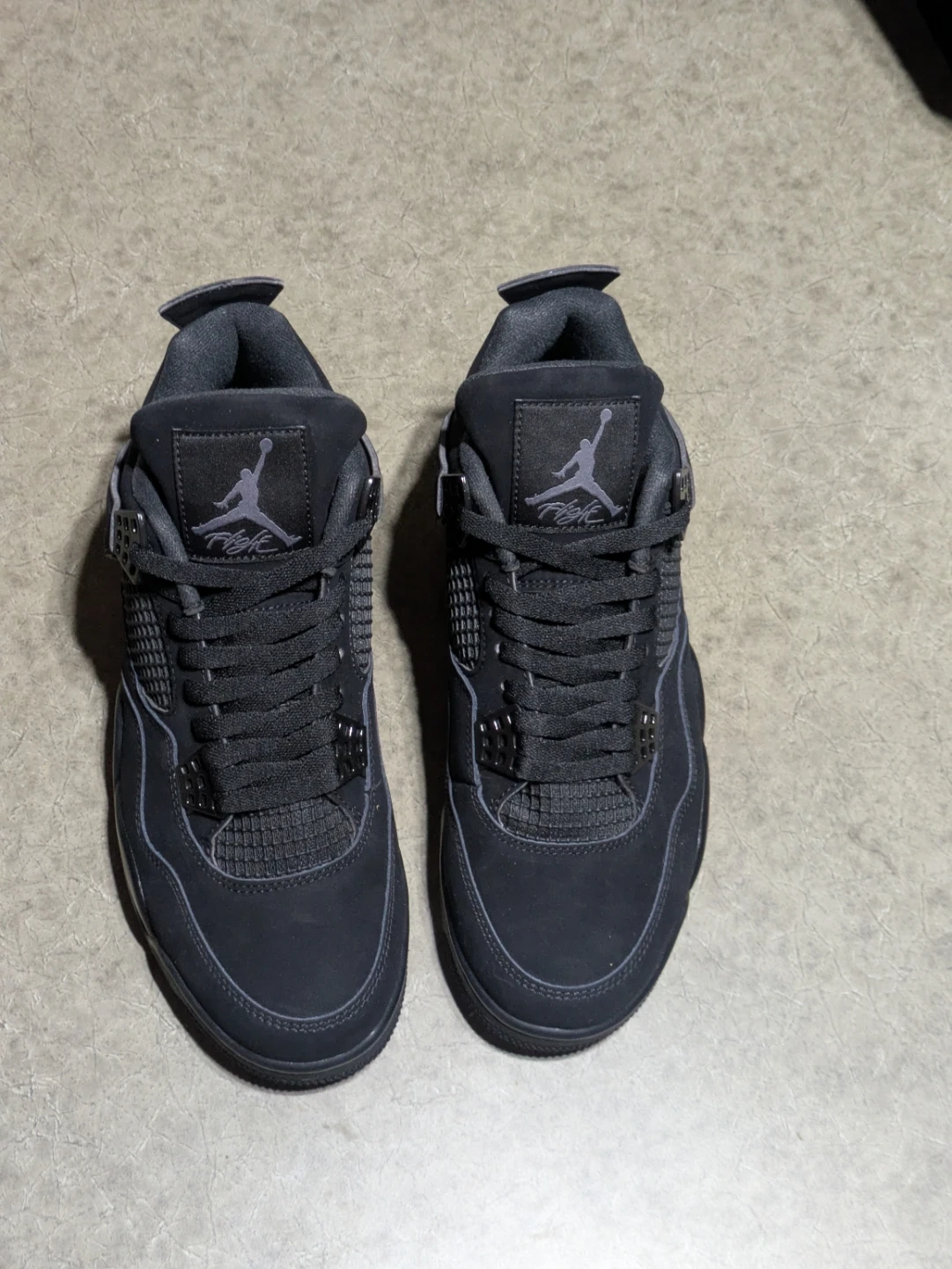 Air Jordan 4 Retro sneakers in a black colourway. Men's size 9.5. These shoes feature a durable design for everyday wear.