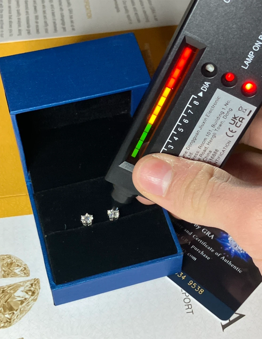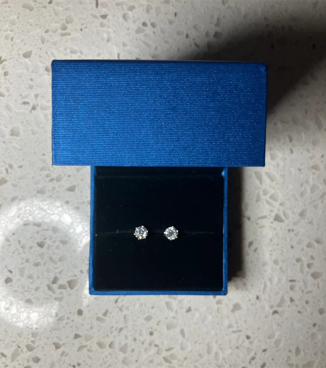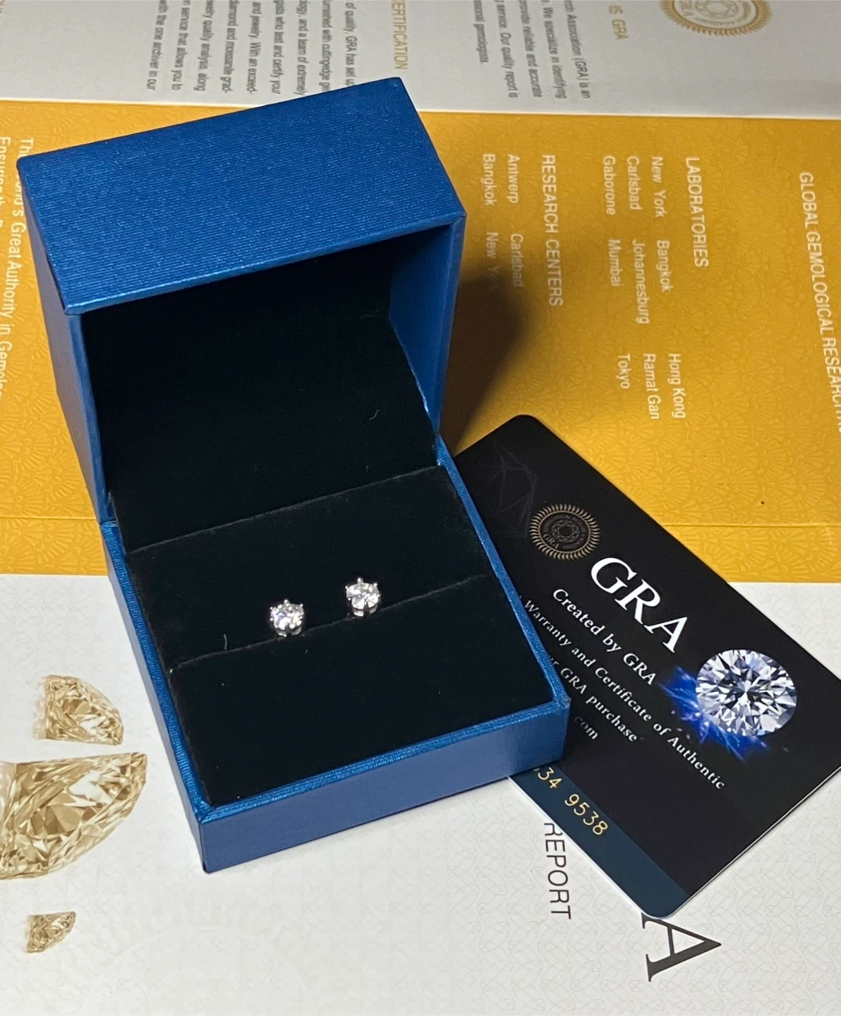 These beautiful stud earrings feature diamond simulants, each approximately 0.5 carat, for a total of 1 carat and size is 5.0mm. They come with a GRA Certificate of Authentic for peace of mind. The earrings are presented in a stylish blue gift box.