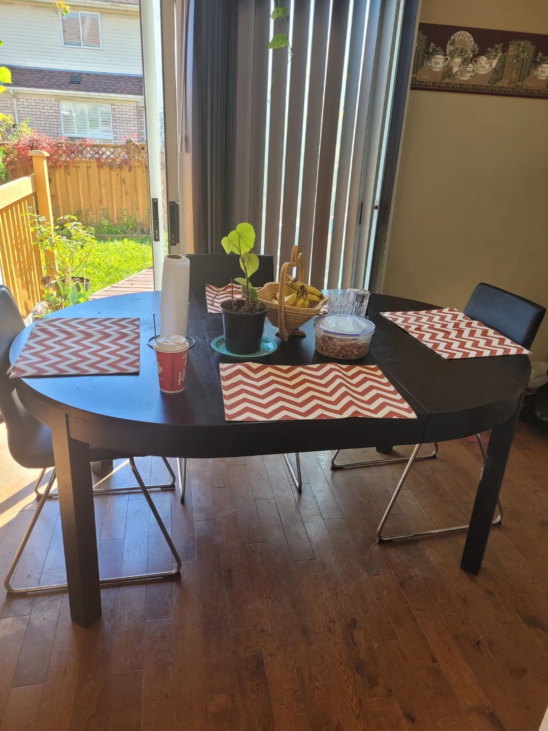 This is a round dark wood dining table. It comes with four black chairs with metal legs. Four red and white chevron patterned placemats are included. Perfect for a cozy dining space!