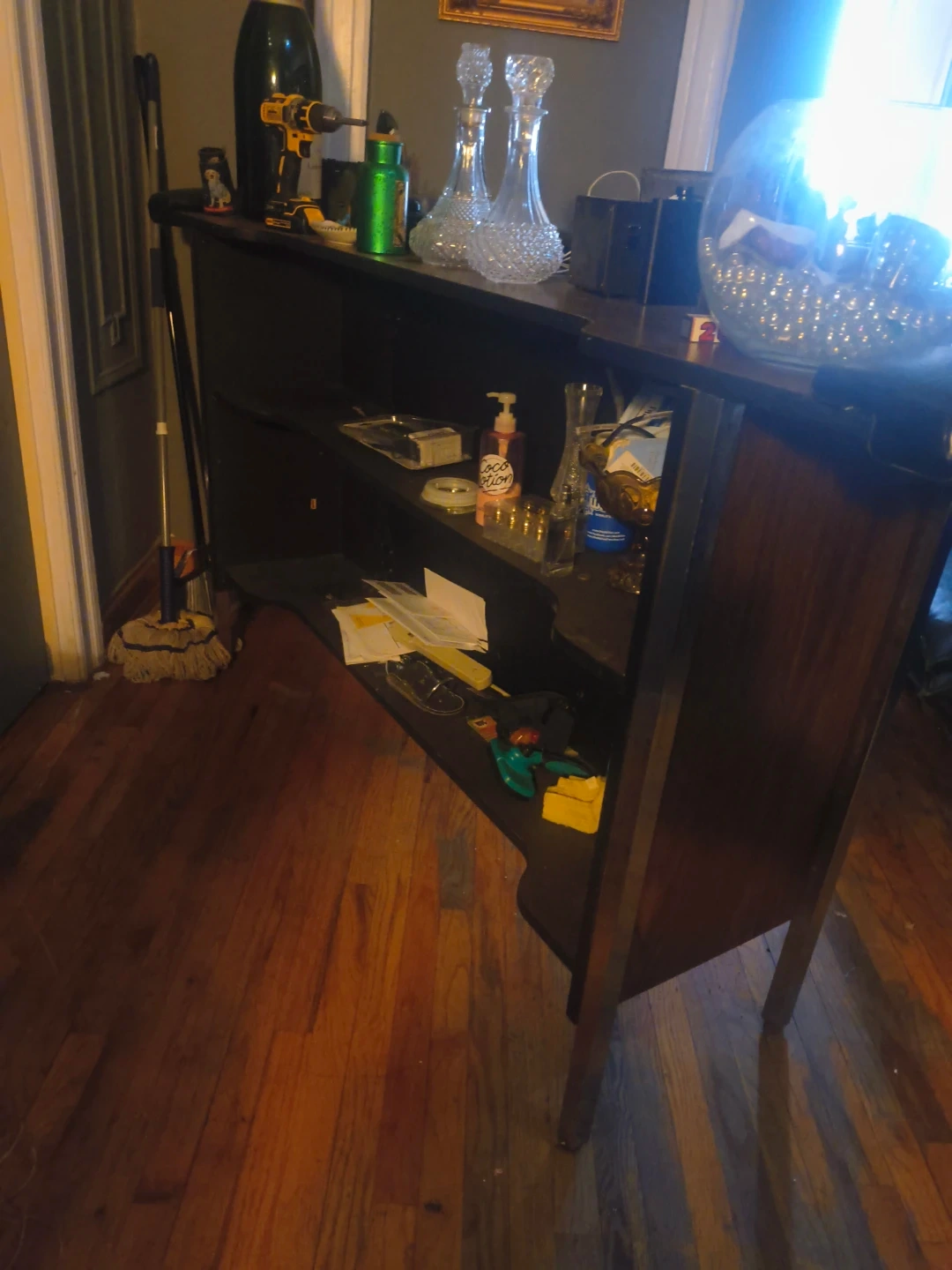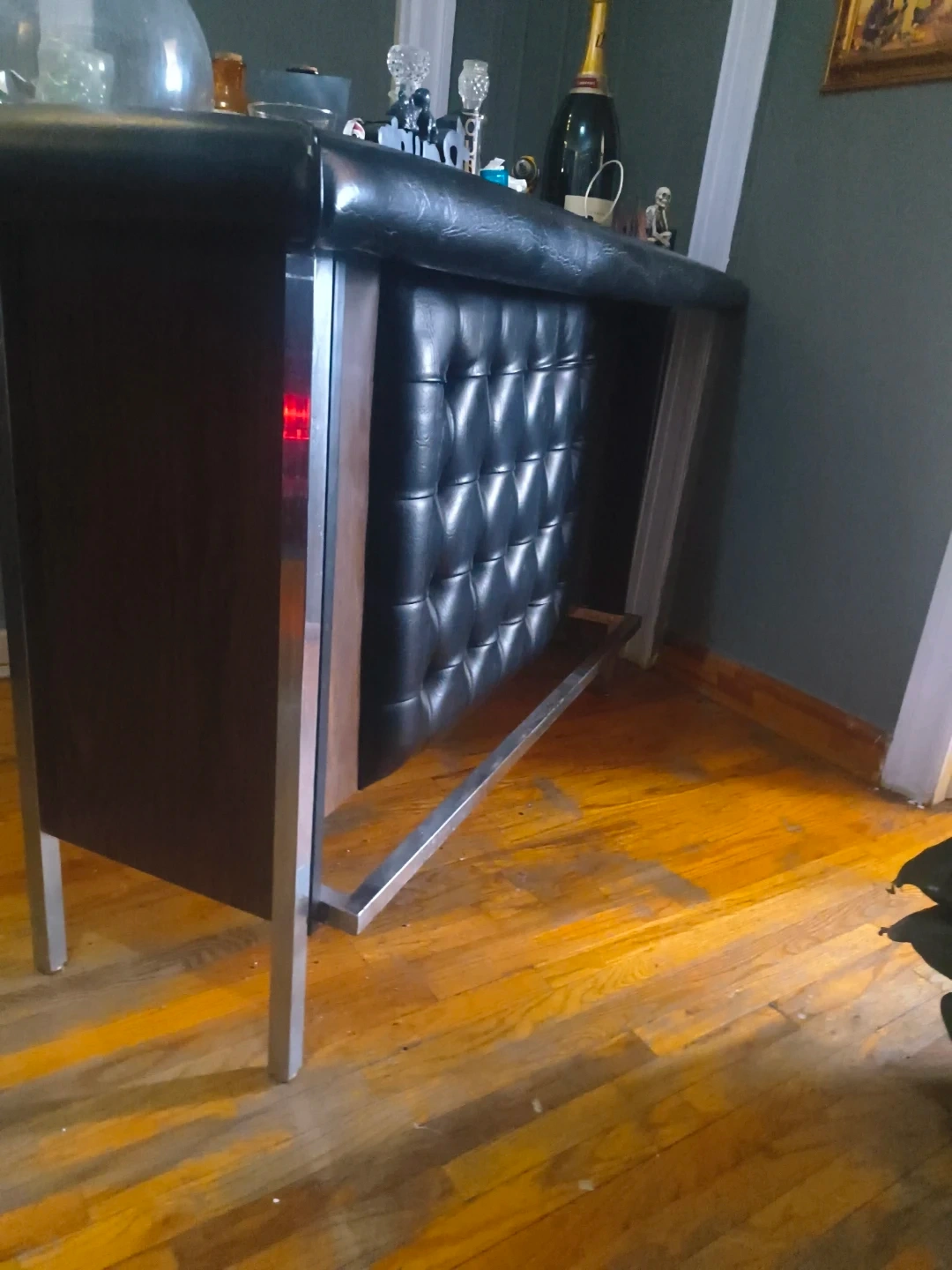 This bar unit features a tufted black faux leather front panel and a dark wood grain finish. It includes a metal footrest and open shelving on the back. Its classic design is perfect for a home entertainment space. Dimensions are approximately 42" tall, 48" wide, and 20" deep.
