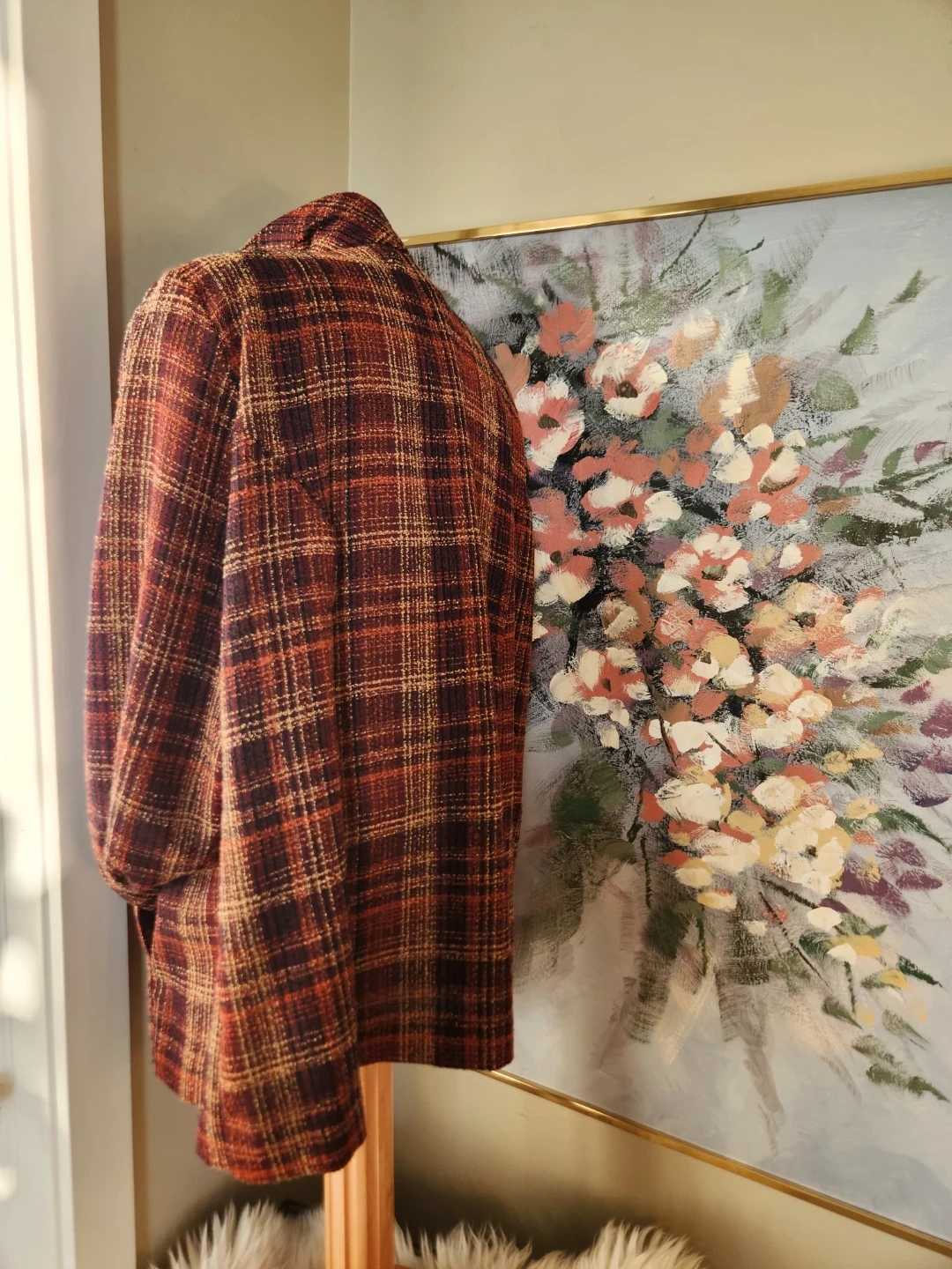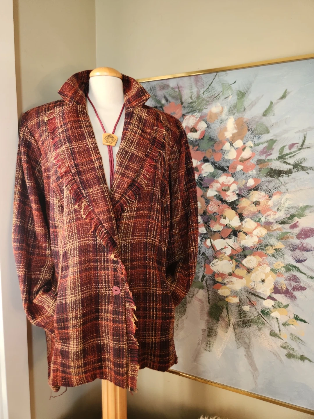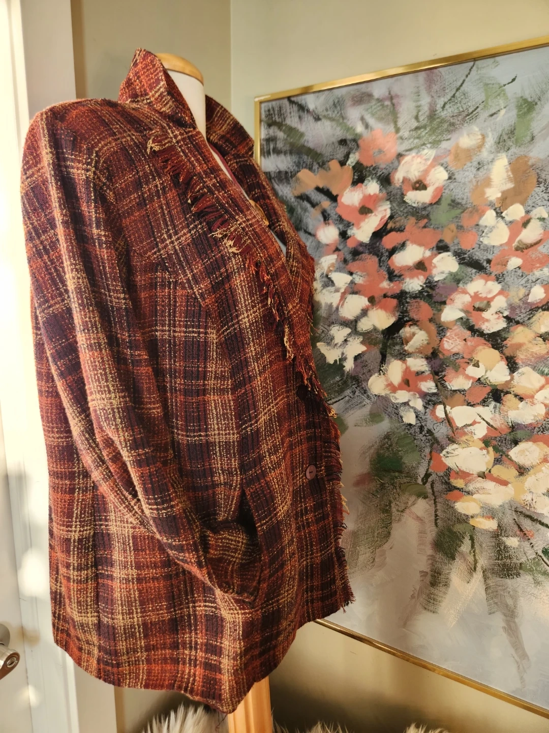 One of Jackie's favorite 1990s blazers! Chic light weight tweed jacket features a classic plaid pattern. This vintage size 20 blazer is perfect with jeans, dress pants or skirts! It has a stylish fringed trim and has convenient Pockets.