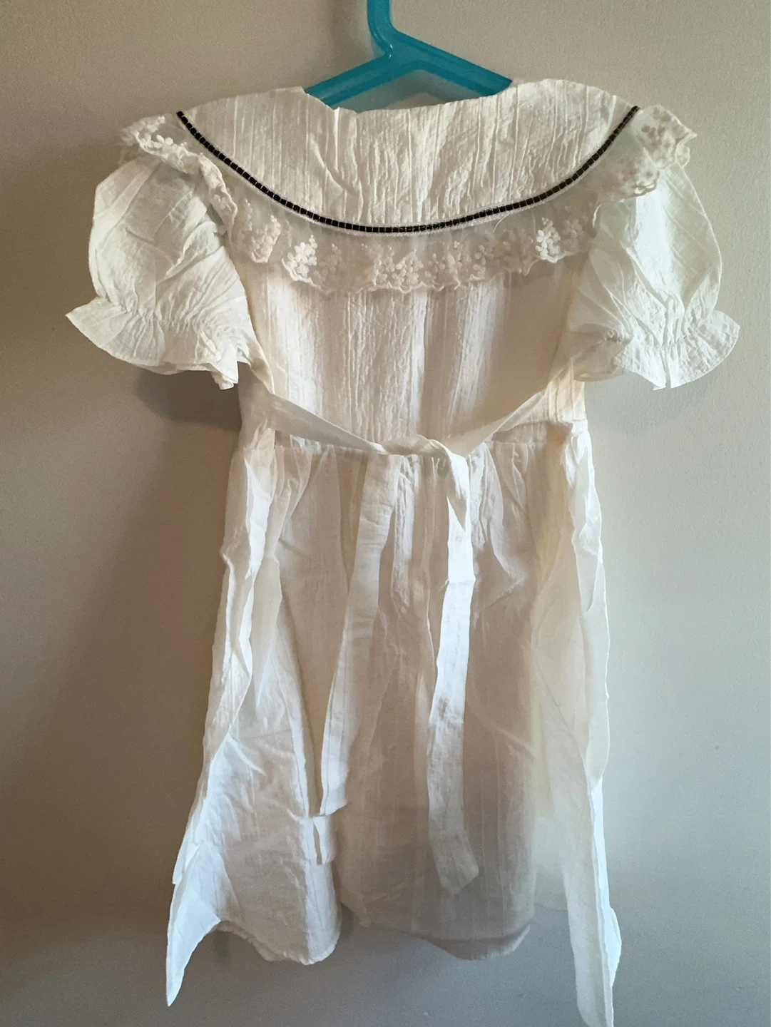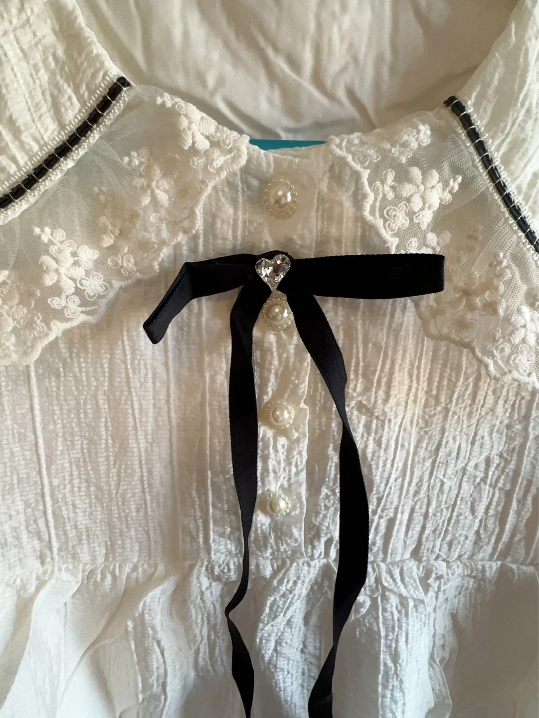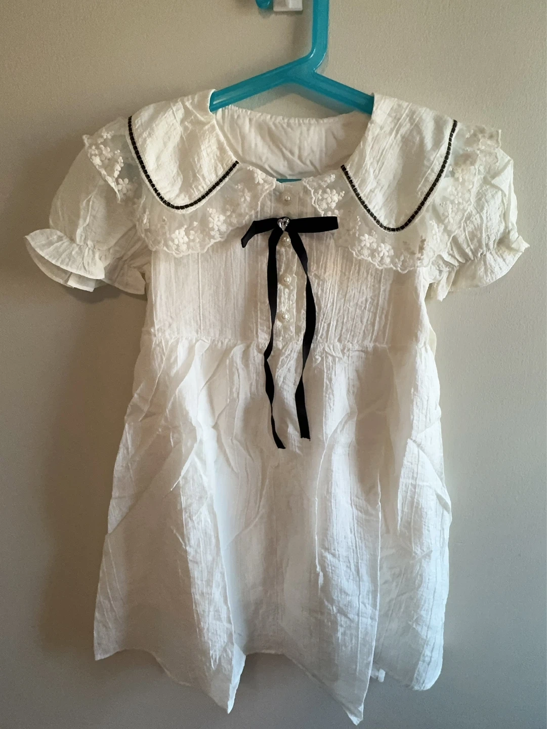 This white short-sleeved dress features a ruffled Peter Pan collar with lace trim and black ribbon accents. A black velvet bow with a pearl and rhinestone accent adorns the front, along with pearl buttons. It has a tie-waist for an adjustable fit. This dress is perfect for casual wear or special occasions!