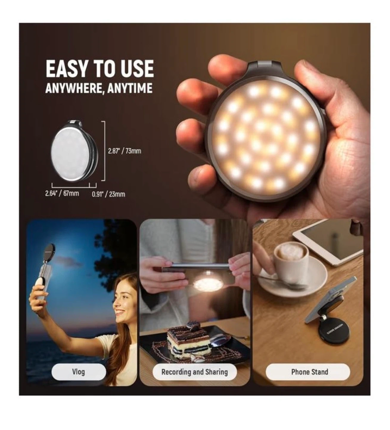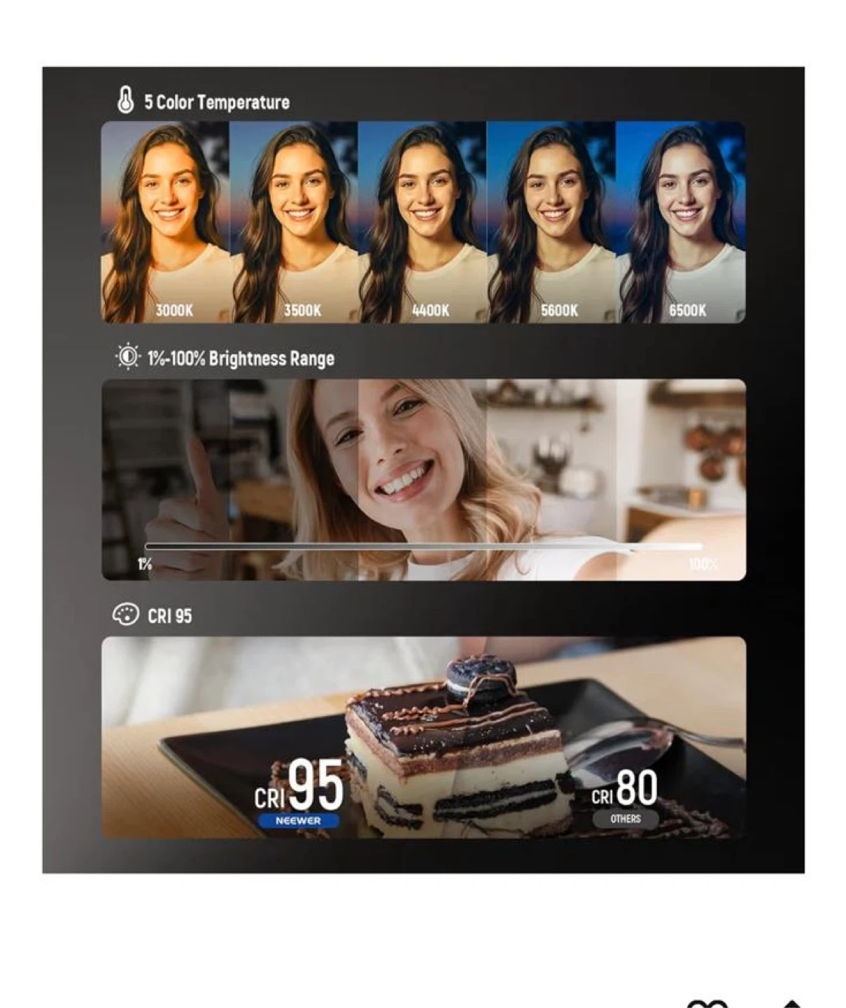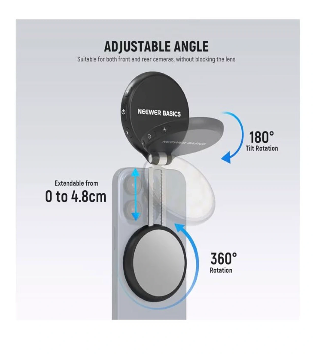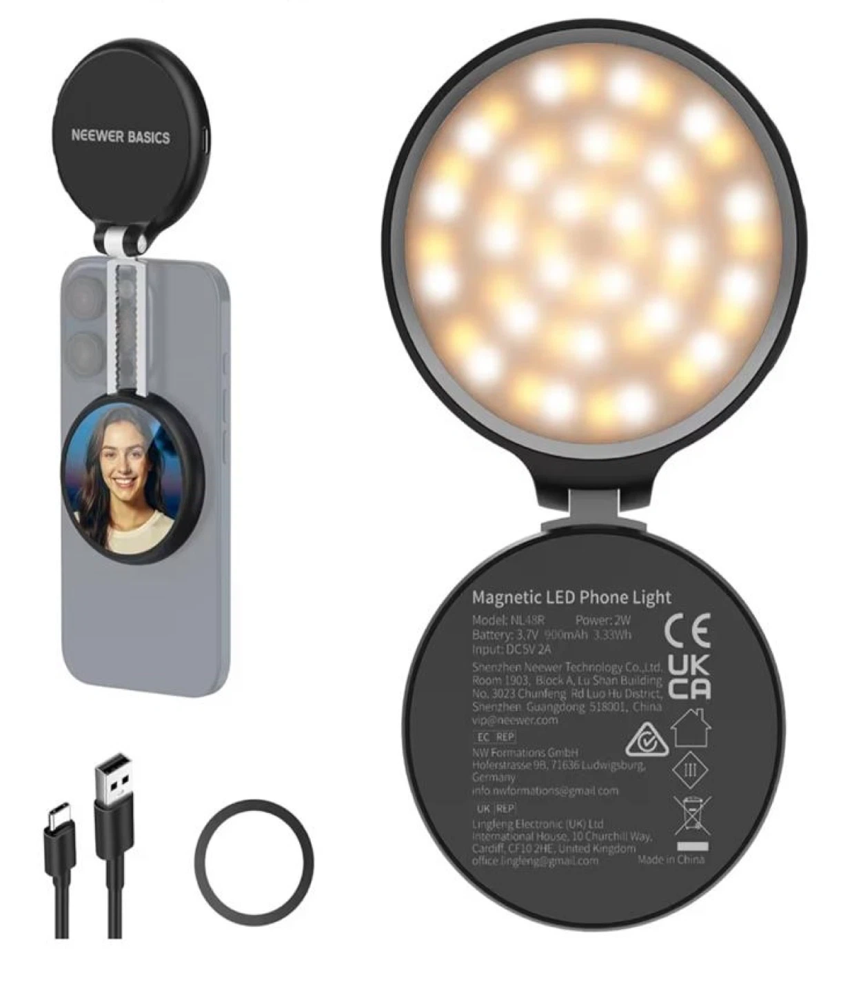 This is a NEEWER Basics magnetic LED selfie light. It's easy to use anytime, anywhere! It has a built-in HD makeup mirror and can be used as a phone stand. The light has 5 colour temperatures and a 1-100% brightness range. It also features: