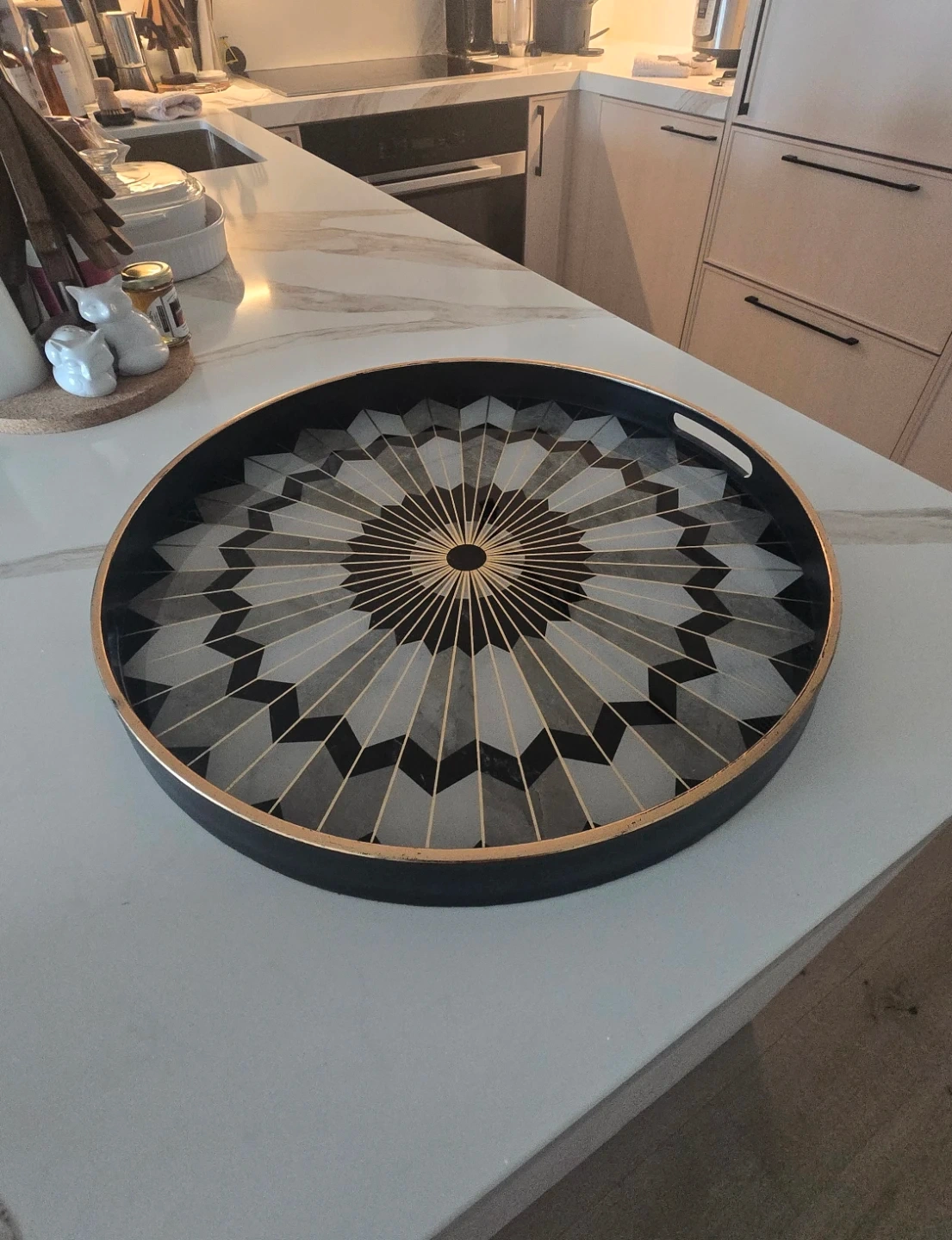 Selling a round decorative tray with a geometric pattern in shades of grey and black, accented with gold trim. It would look lovely as a coffee table centerpiece or for serving drinks