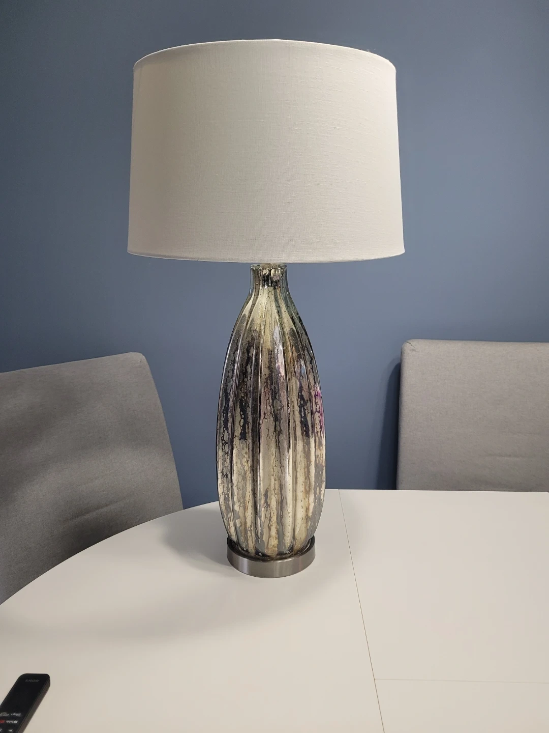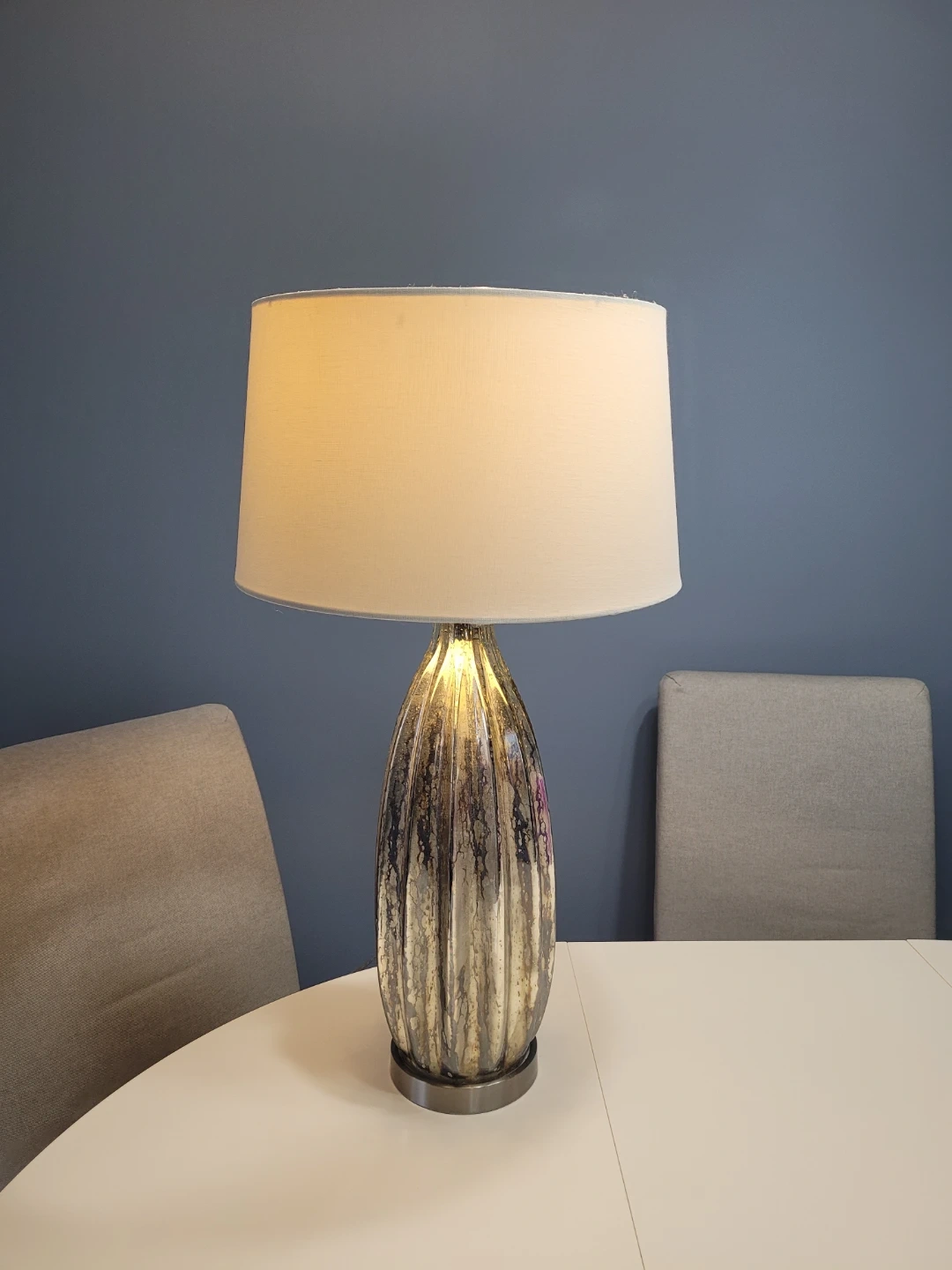 This table lamp features a textured look mercury glass base with a fluted design. It's topped with a simple white drum shade. Adds a touch of elegance to any room!