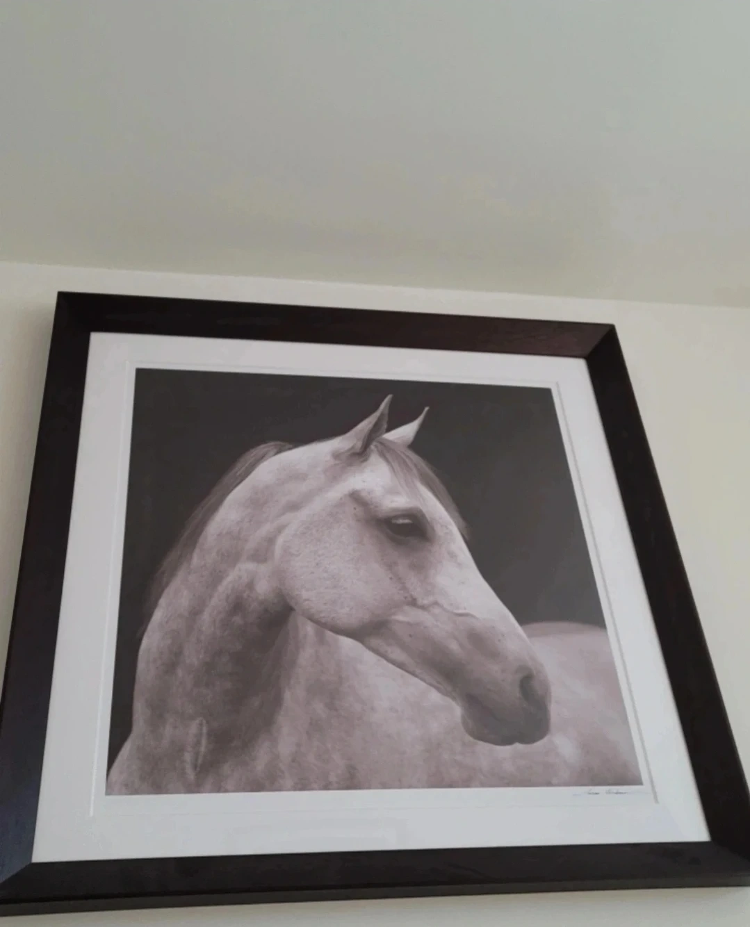 This is a framed print featuring a detailed black and white portrait of a horse. The artwork is housed in a dark wood frame with a white mat. It's a striking piece for any horse lover's home.