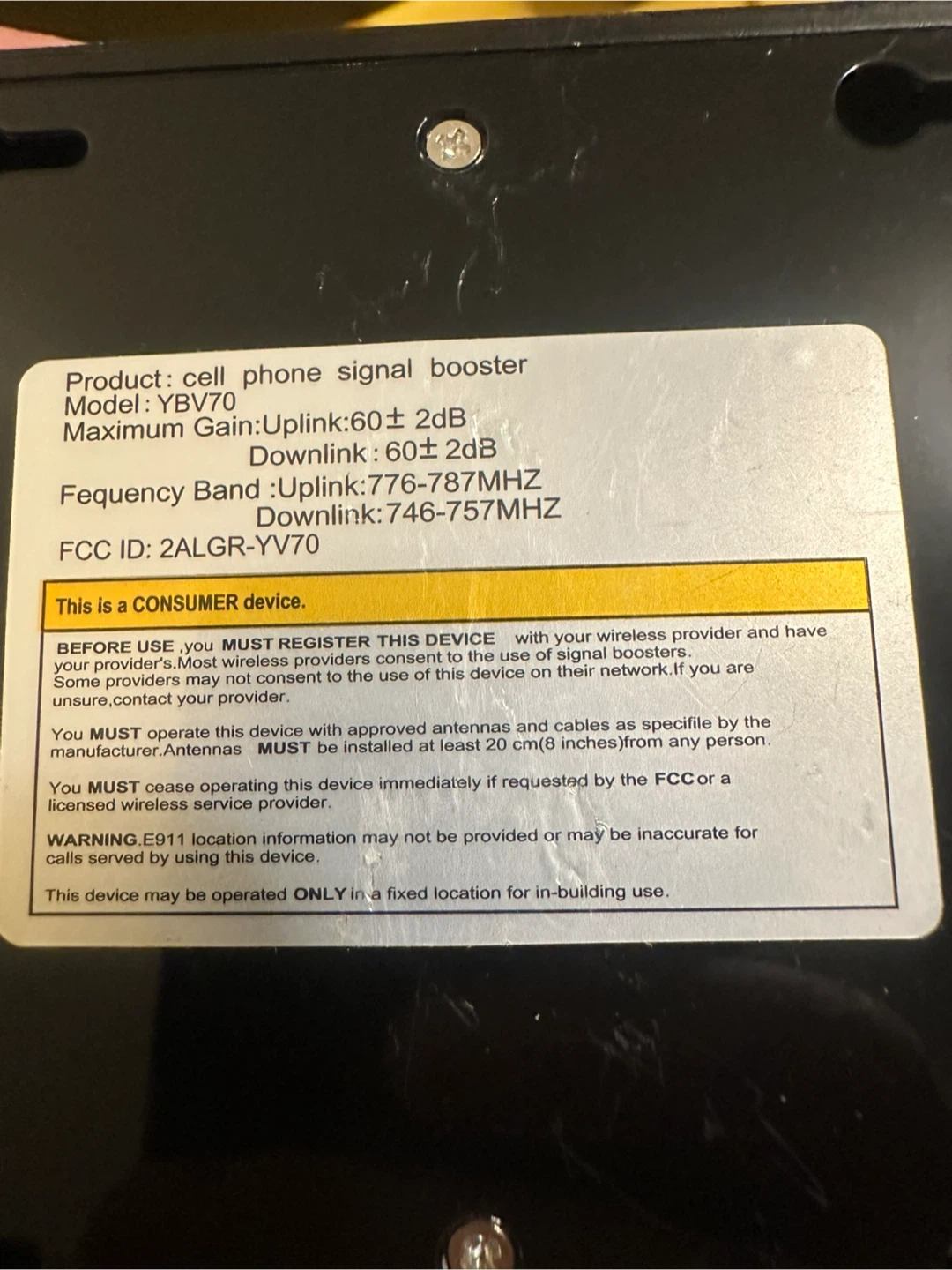 This is a cell phone signal booster, model YB70. It features uplink and downlink gain of 60+/- 2dB. Frequency band is 776-787MHz uplink and 746-757MHz downlink. This device is for indoor use only and must be registered with your wireless provider.