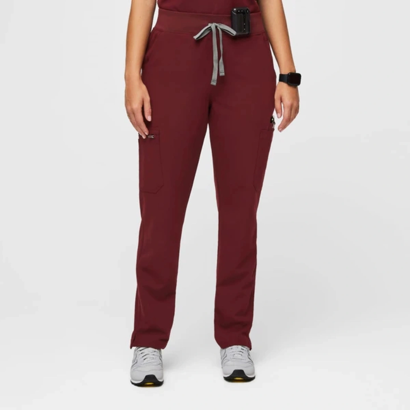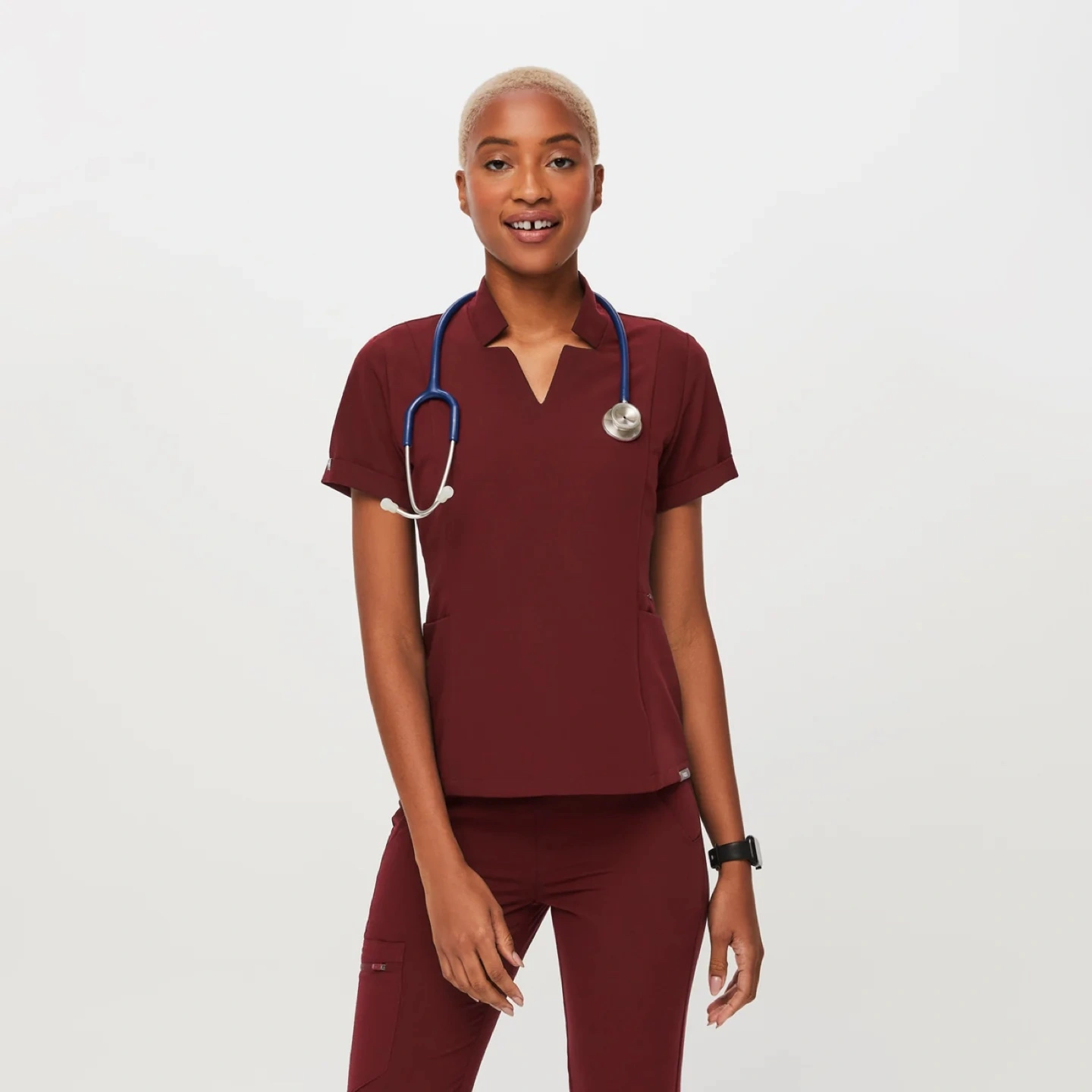 Burgundy scrub top and pants set. Short sleeve top with a V-neck and a drawstring waistband on the pants.