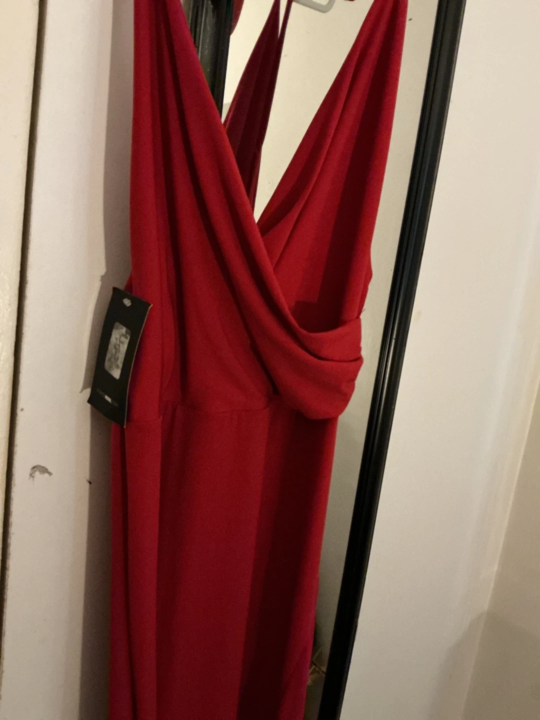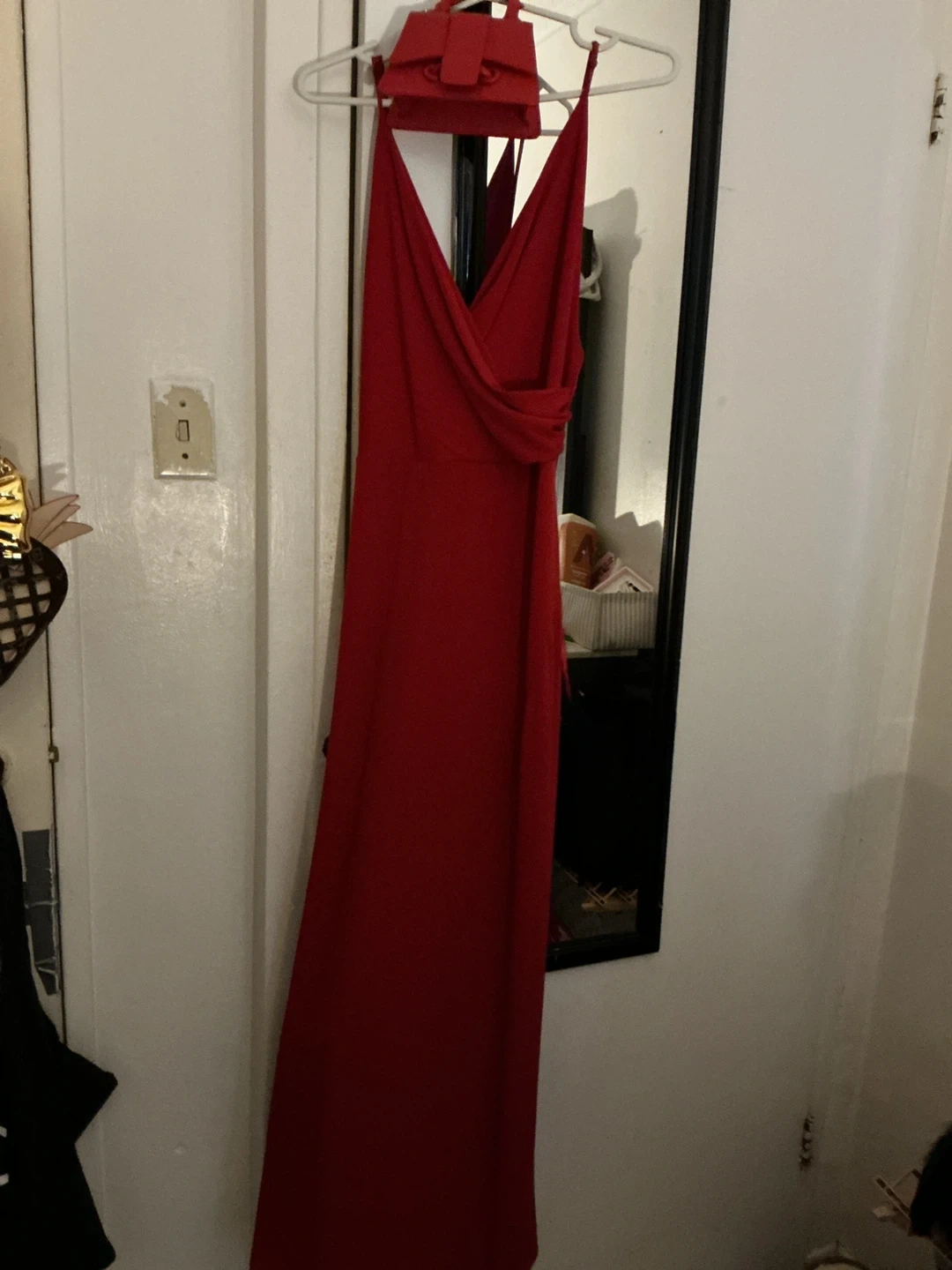 Stunning red maxi dress with a halter neckline and draped detail. It includes a matching clutch bag, perfect for special occasions. This dress is sure to turn heads!