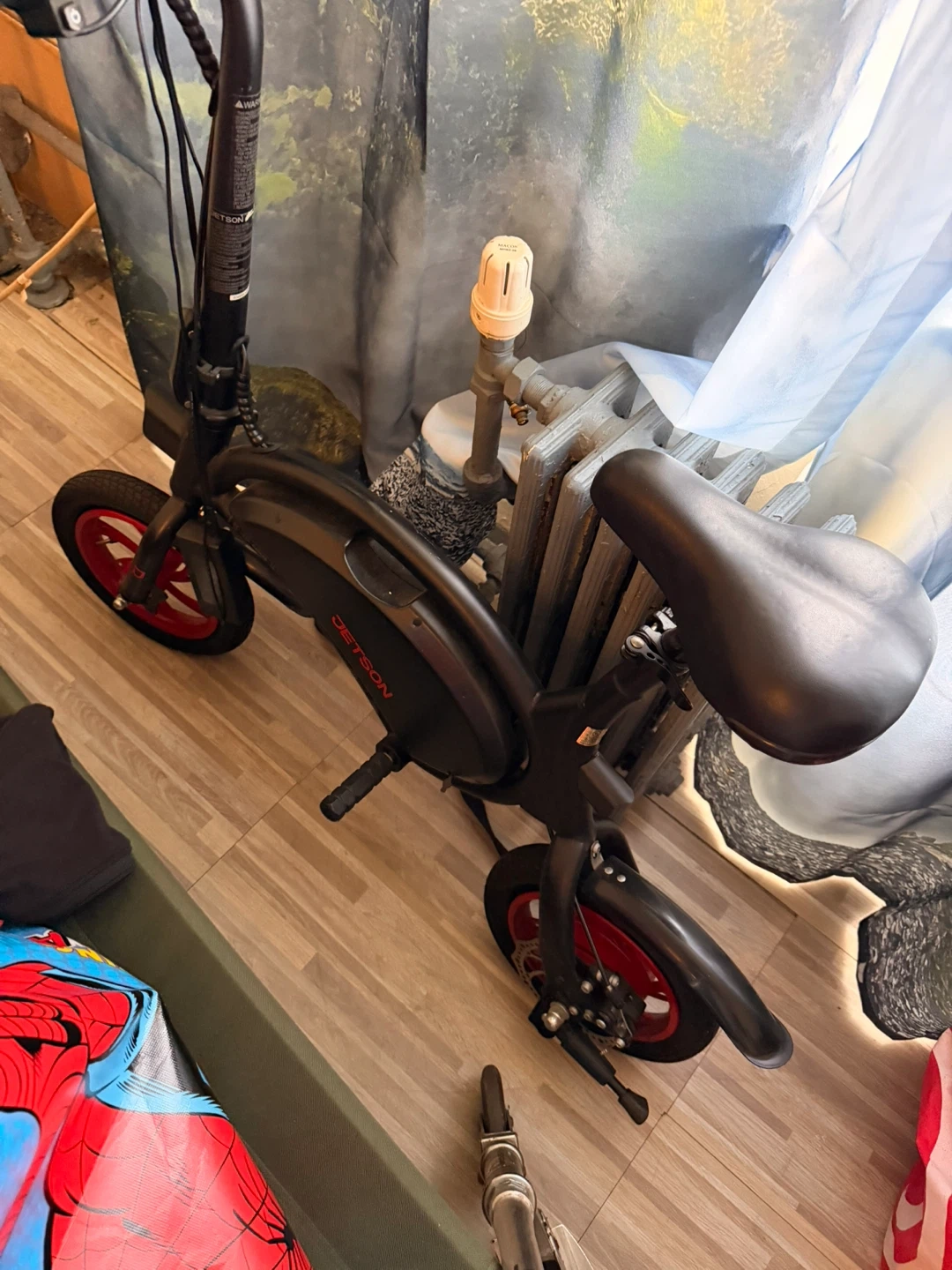 This black Jetson electric folding bike is a convenient way to get around. It features a compact design for easy storage and portability. Perfect for urban commutes or quick trips around town!