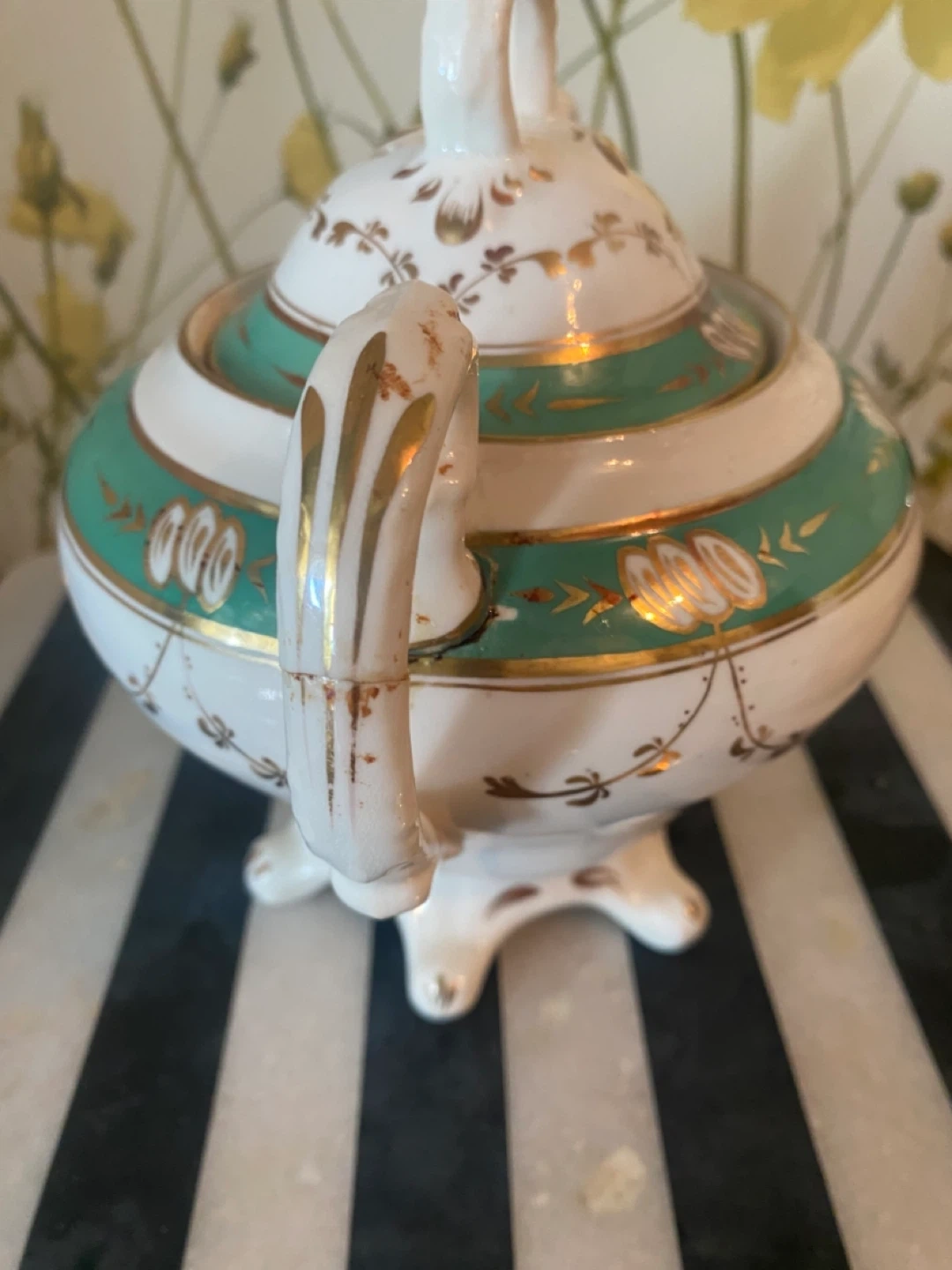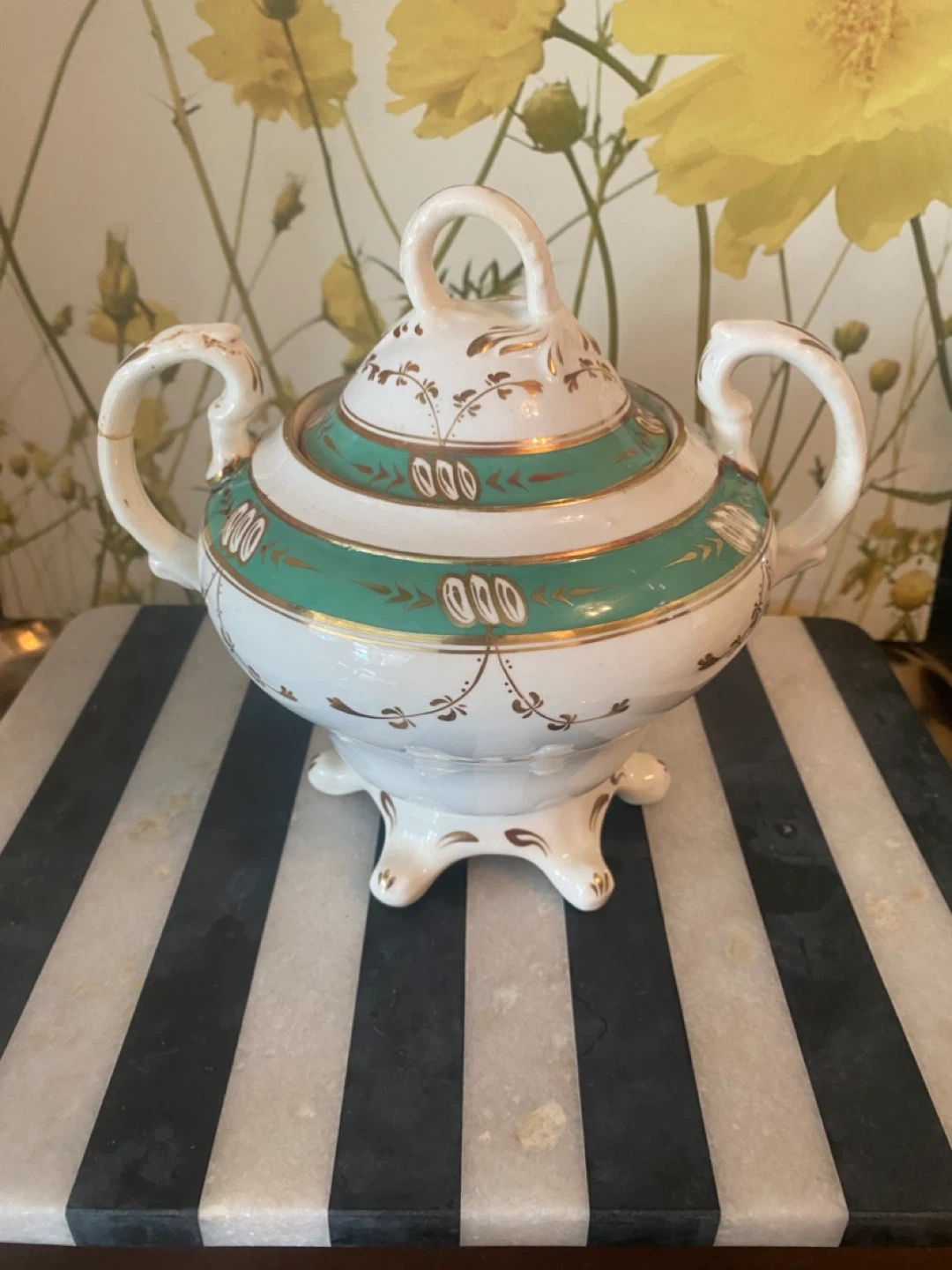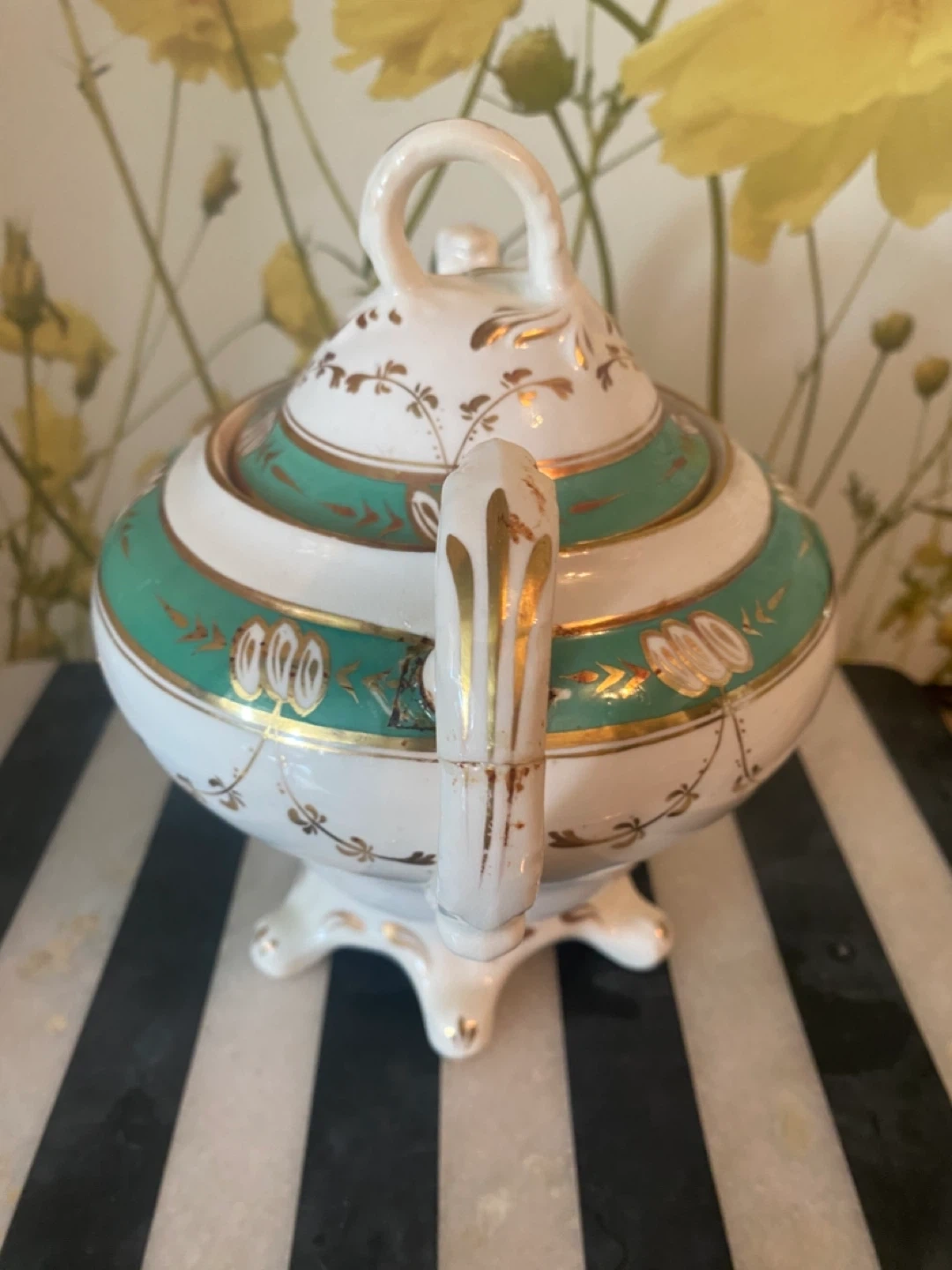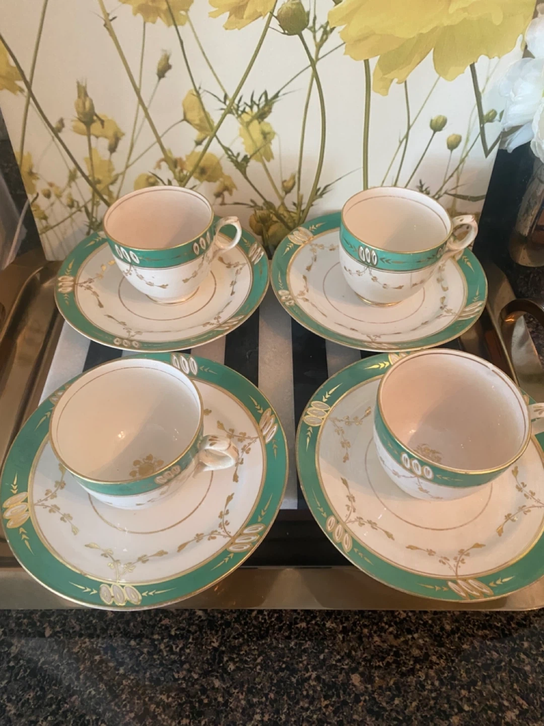This vintage tea set includes four cups and saucers, along with a matching sugar bowl. The set features a white porcelain base with elegant green and gold trim detailing. It's a beautiful collection for any tea enthusiast!Follow me @casa_s_decor Pick up in the Bronx