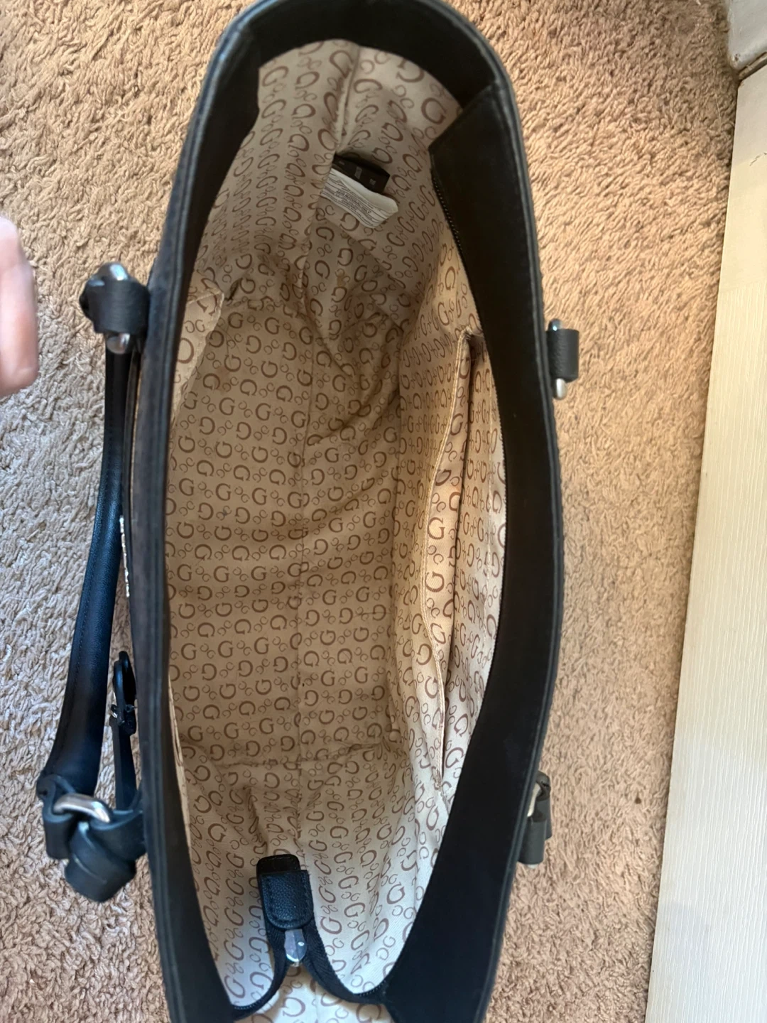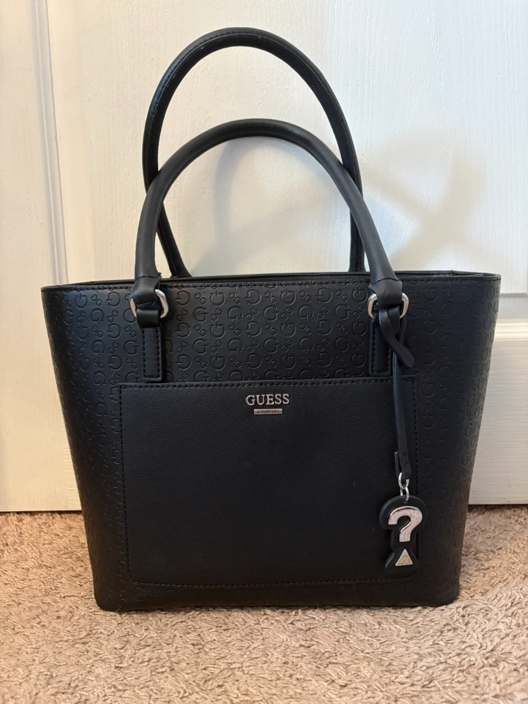 A black Guess tote bag with an all-over G logo pattern lining. It has an exterior pocket and a decorative question mark charm. The interior has multiple pockets for organization.
