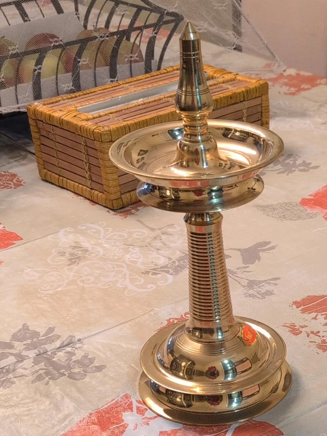 This is a traditional brass diya oil lamp. It's made of shiny brass with a ribbed stem and a flared base. Perfect for adding a warm glow to your home!