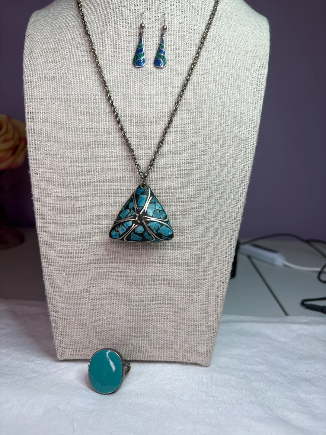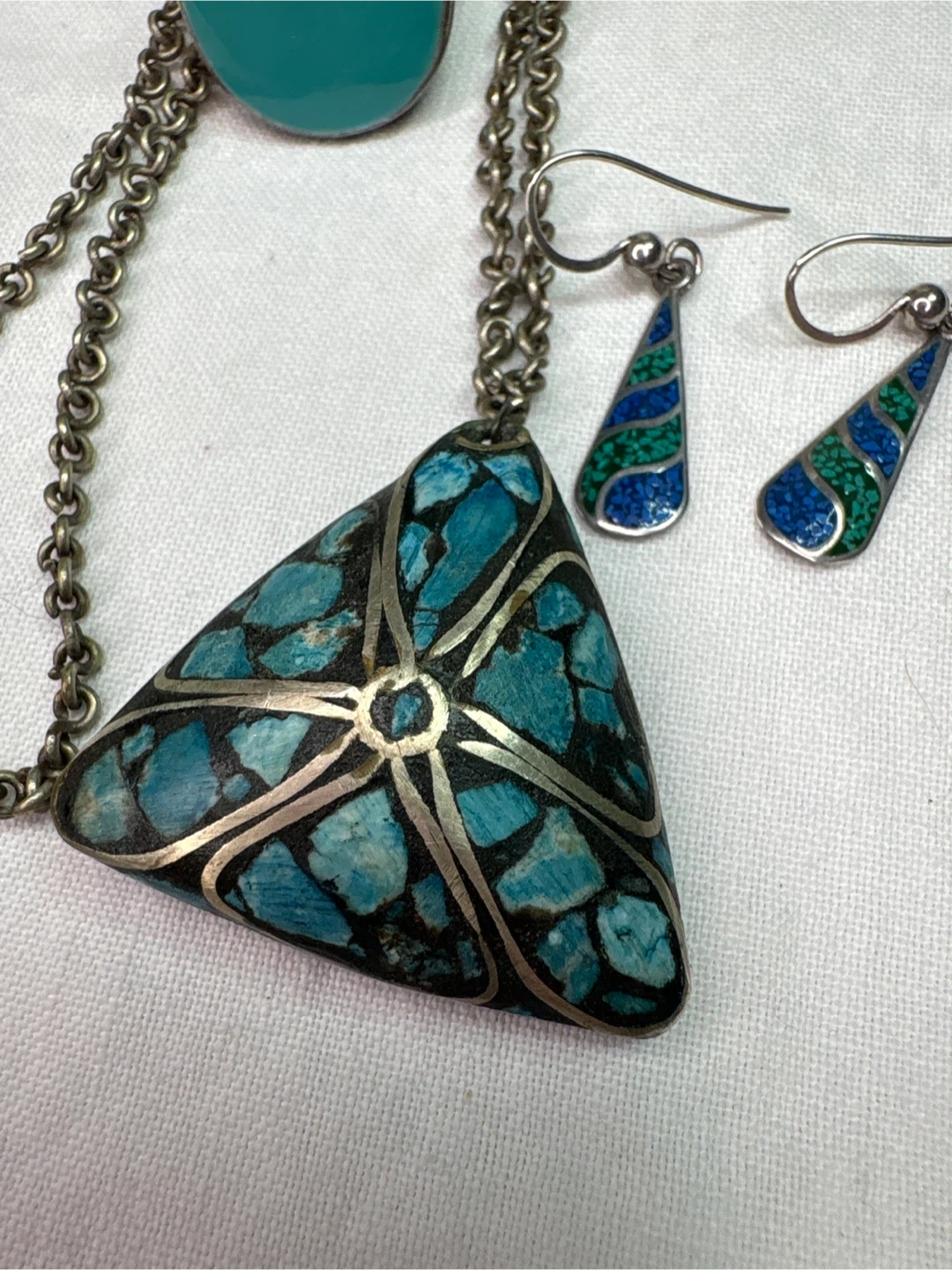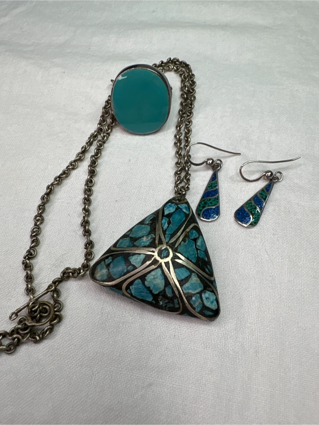 Beautiful sterling silver earrings from Mexico , that have lapis and malachite inlay. A sterling silver ring , size 6.5 with turquoise enamelling and silver tone necklace set with turquoise chip inlay. A Southwestern design. The earrings feature a teardrop shape with inlaid blue and green stones. The necklace has a triangular pendant with turquoise inlay mosaic of stones.