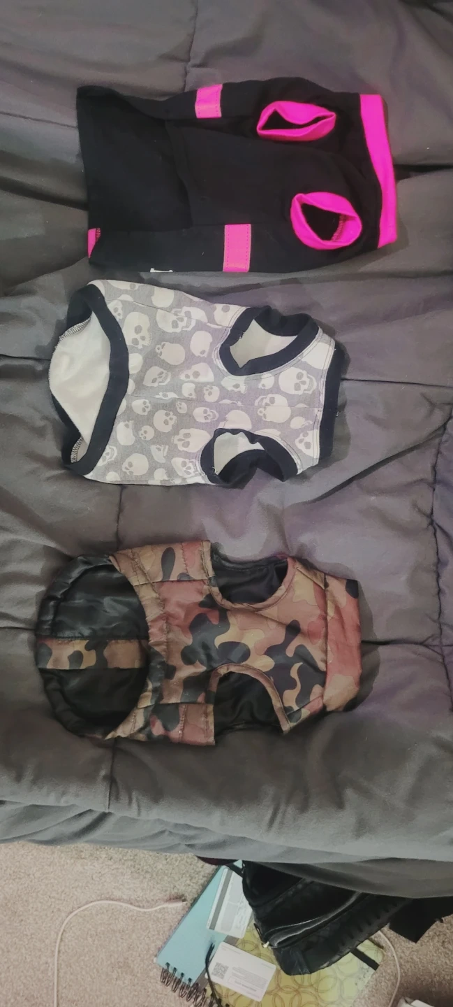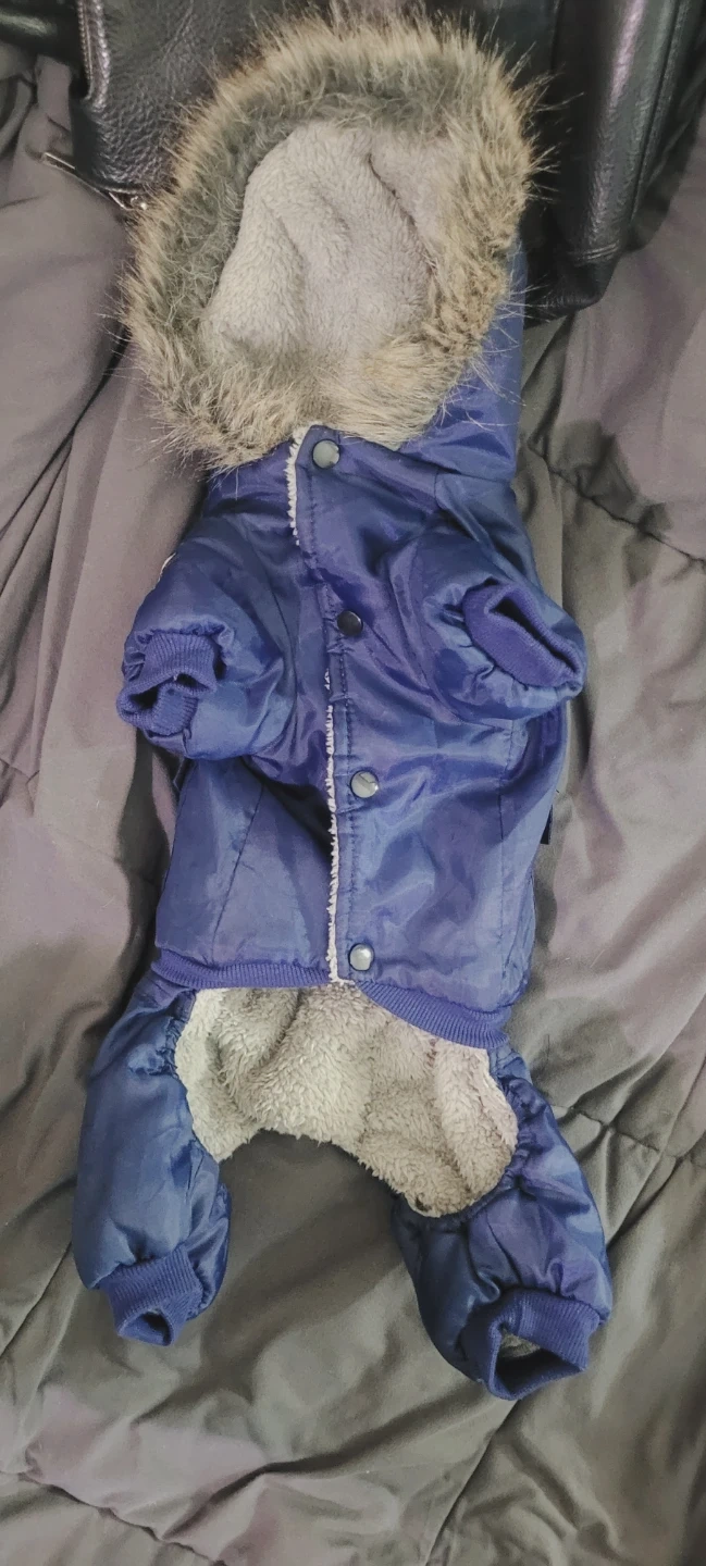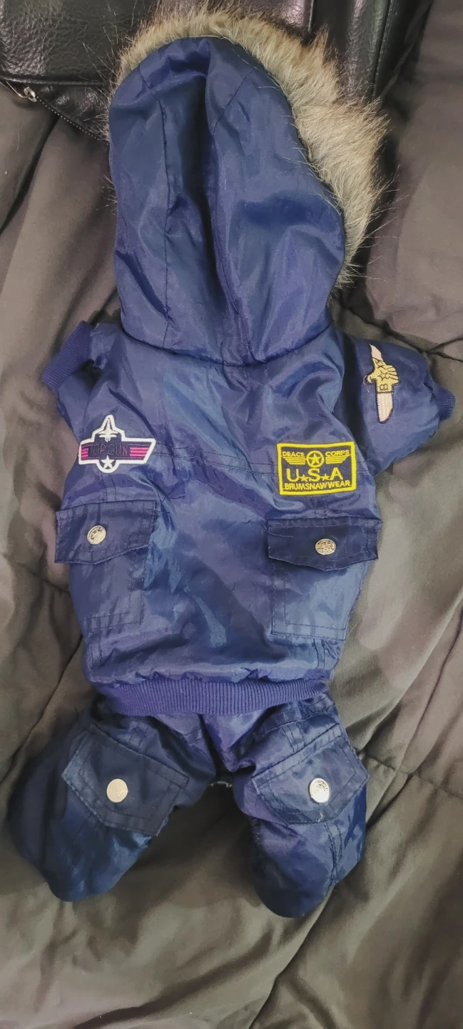 This blue dog winter jacket has a faux fur lined hood and snap closures. It features embroidered patches and utility pockets. It's designed for keeping your pet warm in colder weather. Also included the dog shirts and vests