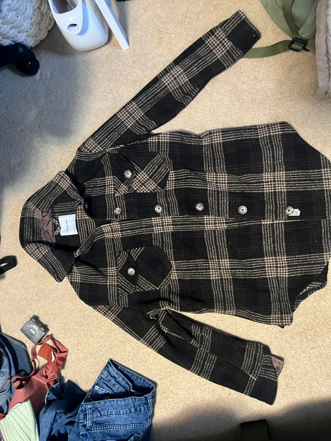 Selling a cute Dynamite plaid shacket in size small! It's in great condition and perfect for layering during the cooler months. The material is soft and cozy, making it a comfortable choice for everyday wear