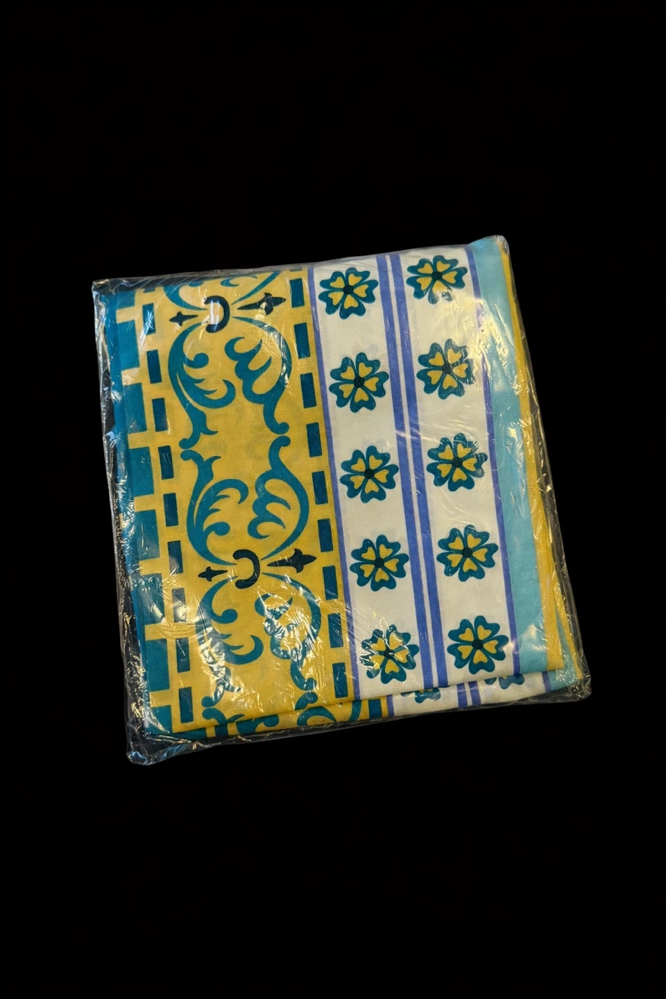 Here's a brand new throw blanket, still in its original packaging! It features a lovely pattern with yellow, blue, and white colours. Perfect for adding a pop of colour to your home or keeping cozy on chilly evenings
