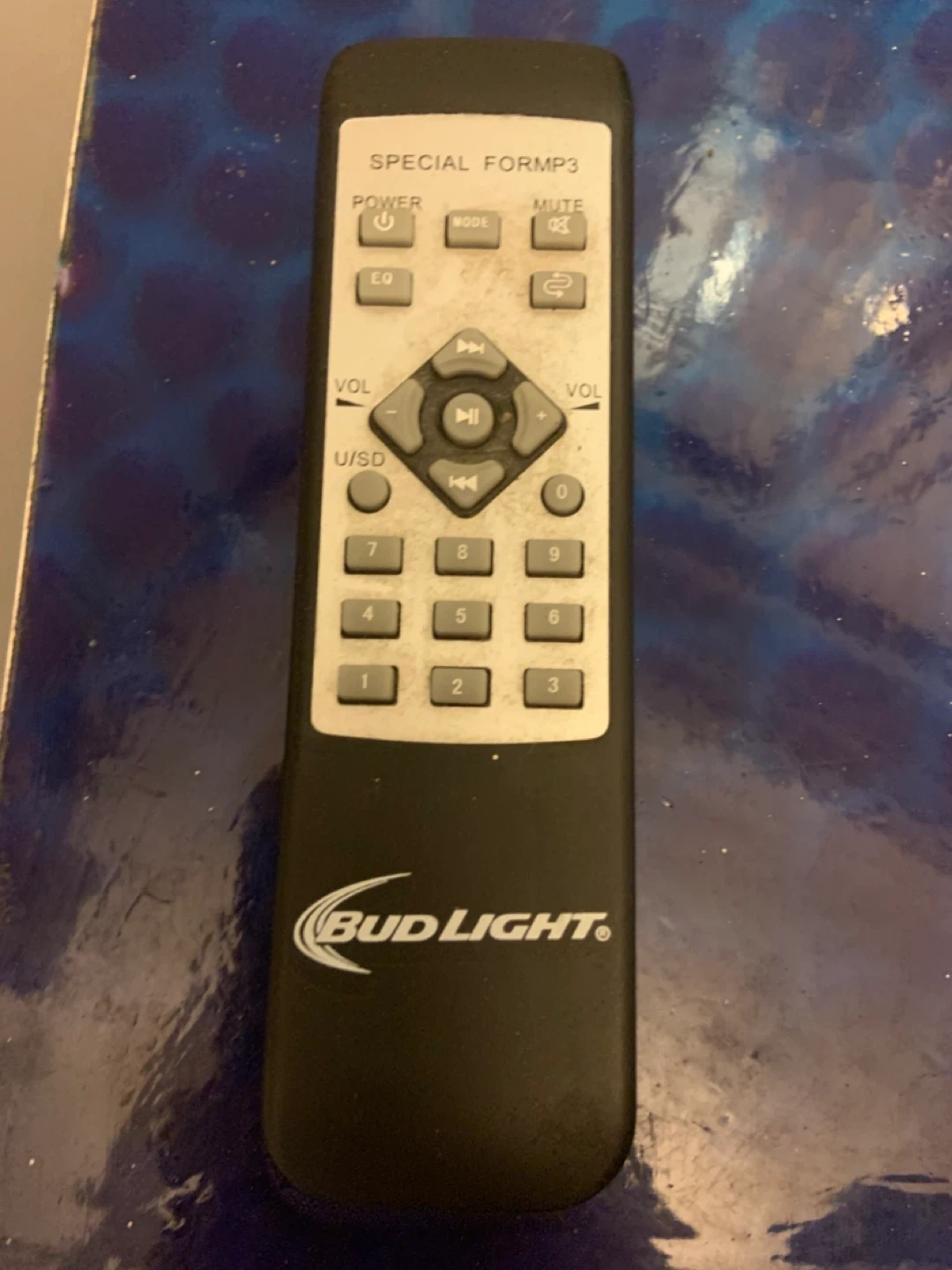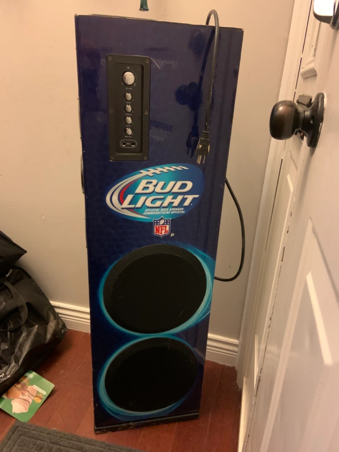 This Bud Light speaker tower features multiple speakers and adjustable volume, bass, and treble control. A remote control is included for easy operation.