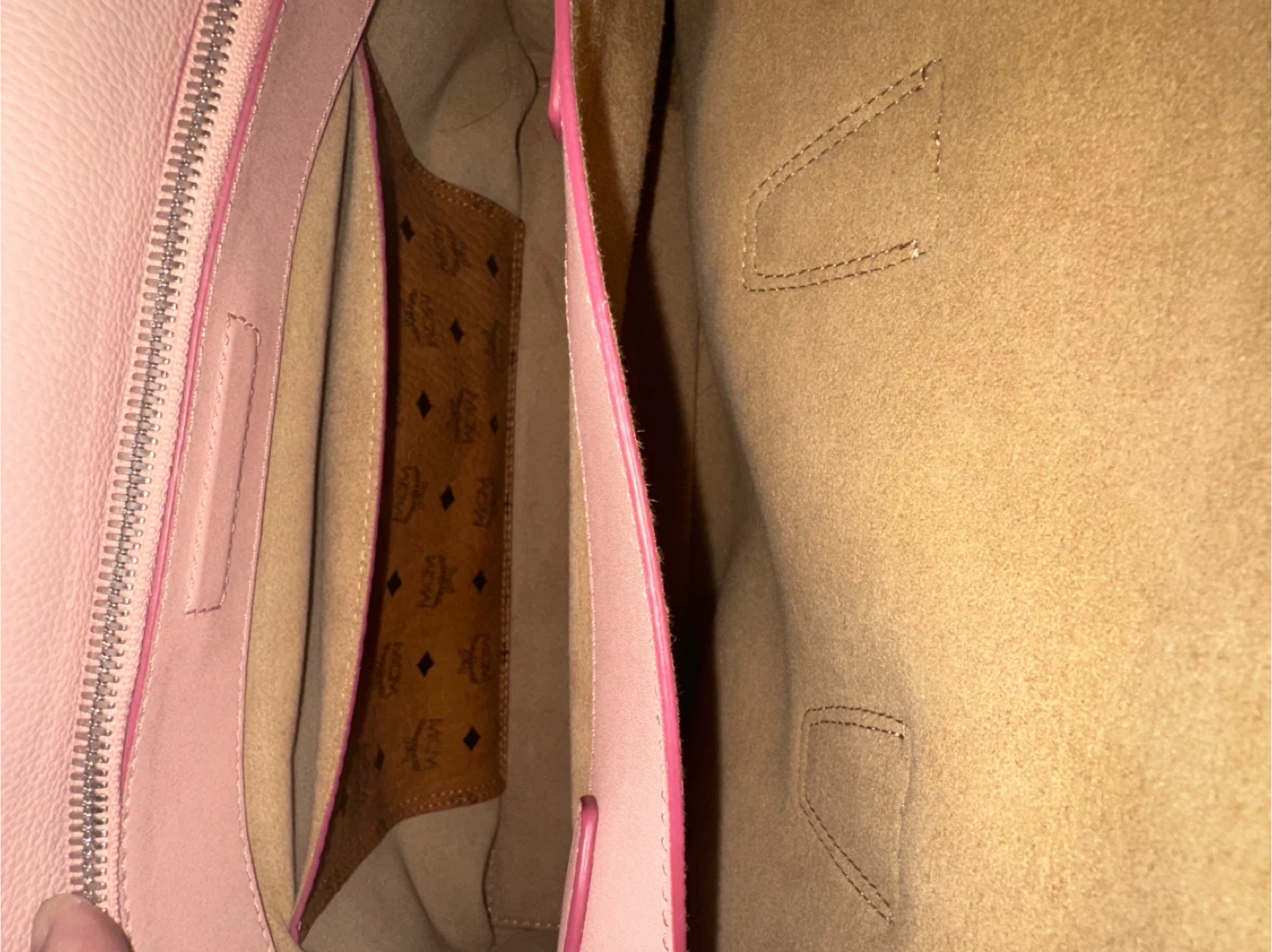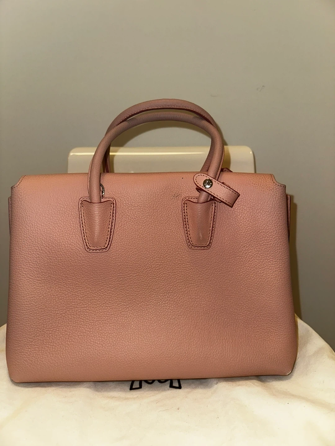 This MCM top handle bag is crafted from pink pebbled leather. It features a spacious interior with pockets and a zip closure. Includes the original MCM dust bag.