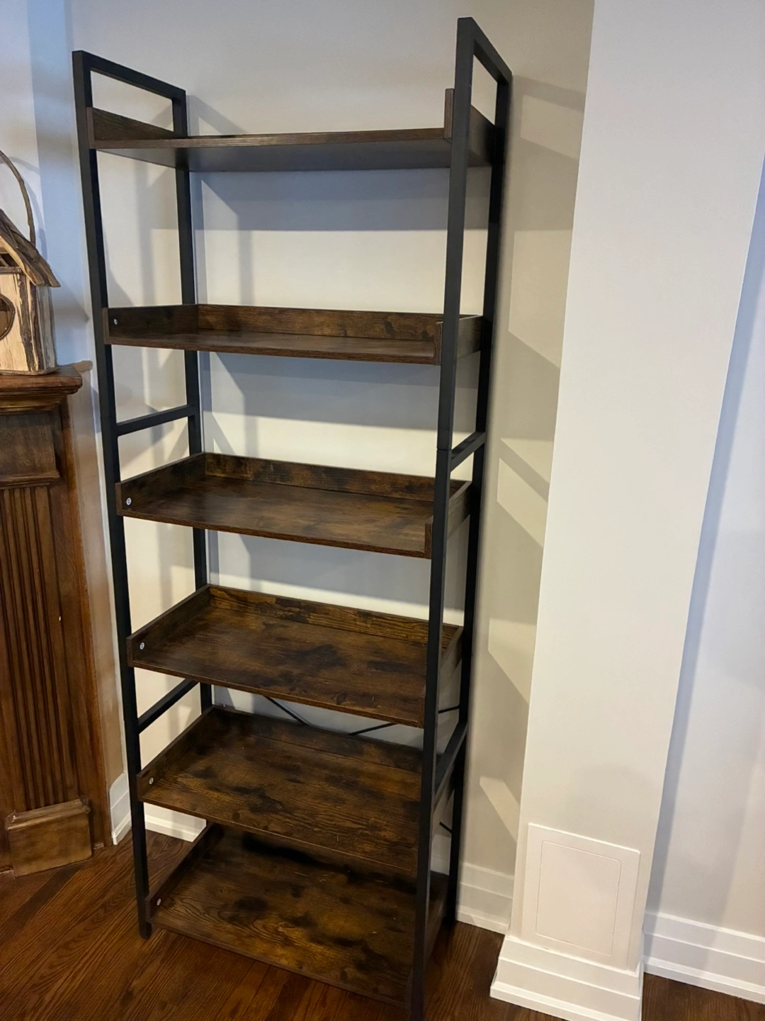 Two bookshelves features a dark wood grain finish on the shelves and a black metal frame. It has six tiers for storage or display. It's a great addition to any room for organizing books or decor.