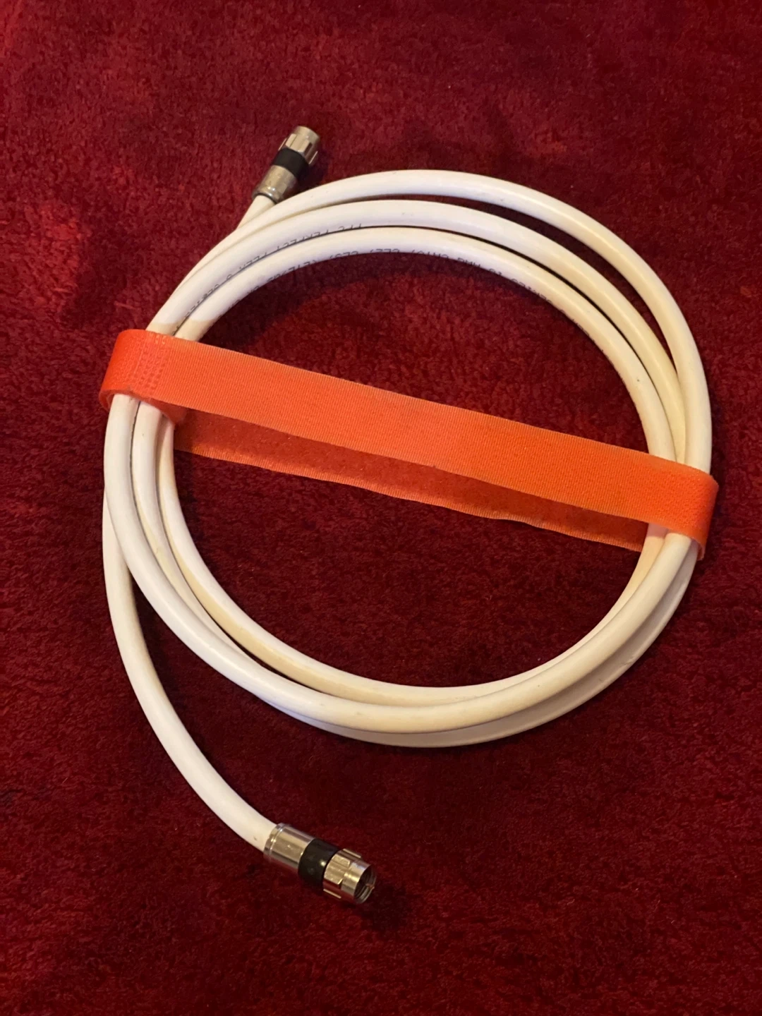 This is a white coaxial cable, commonly used for TV or internet connections. It has standard F-type connectors on both ends for easy attachment. The cable is secured with an orange Velcro strap.