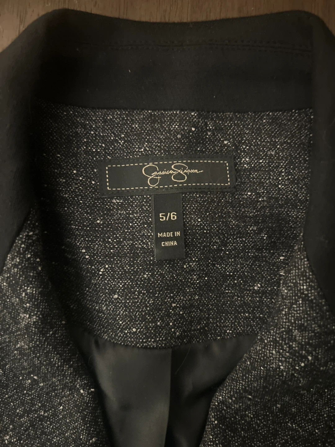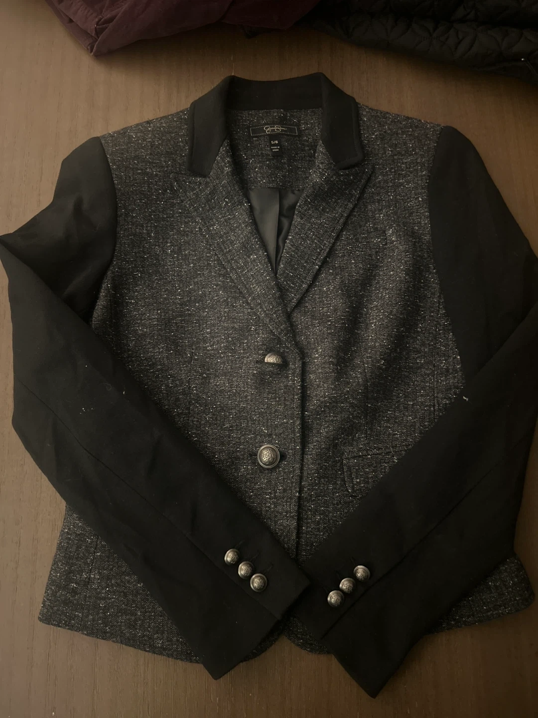This Jessica Simpson blazer features a tweed-like front with black sleeves. It has decorative buttons on the cuffs and front closure. Size is 5/6.