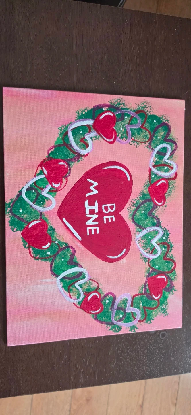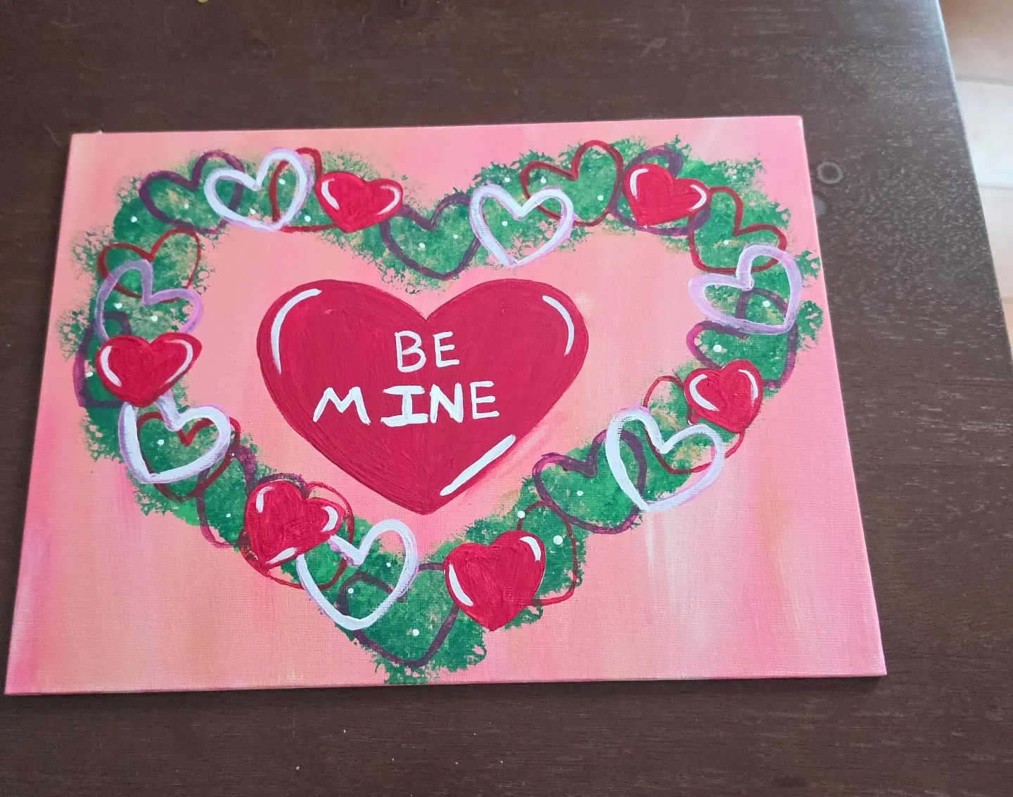 A lovely hand-painted canvas featuring a heart design with "BE MINE" in the centre. It's decorated with a wreath of smaller hearts and green foliage. Perfect for adding a touch of Valentine's Day spirit to your home decor!