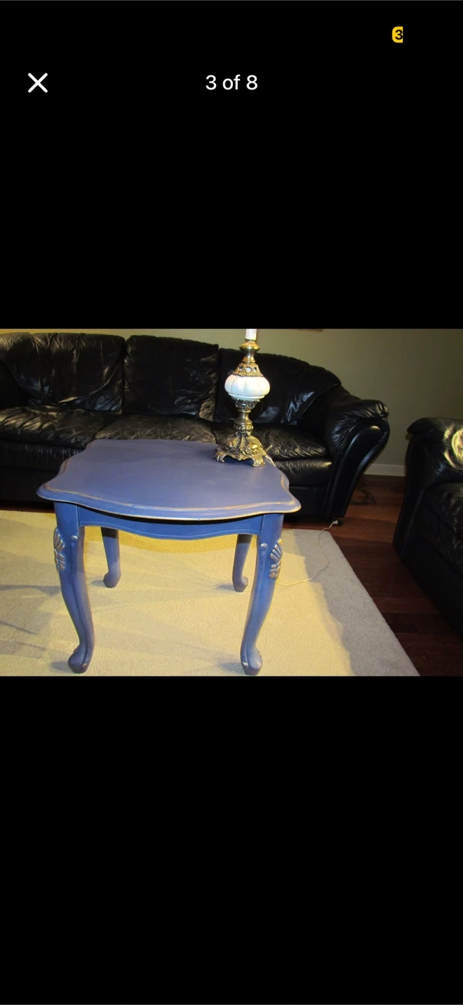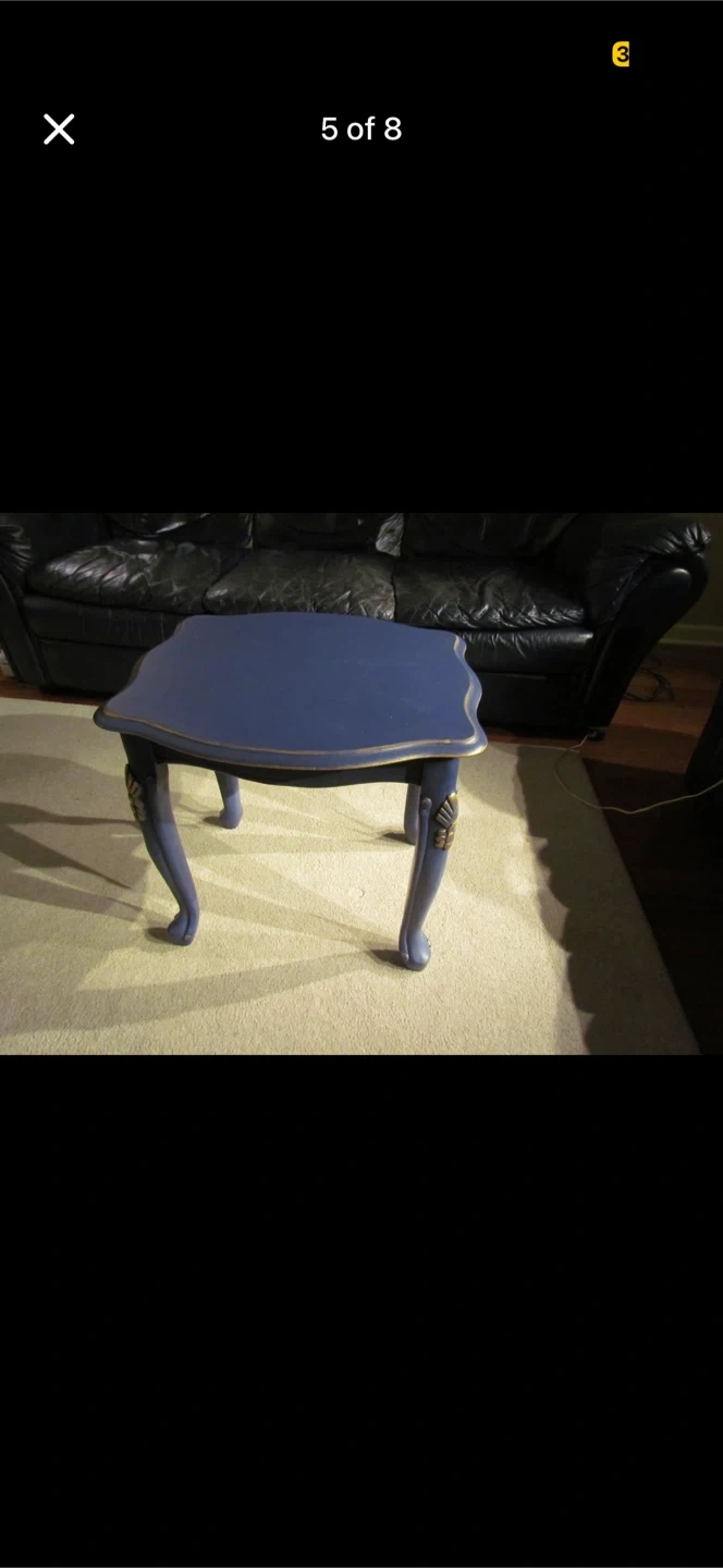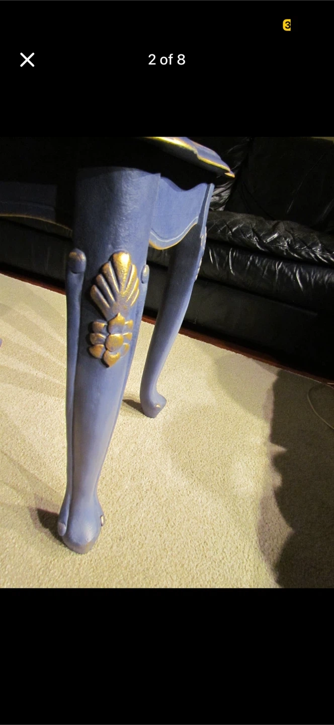 This is a charming blue accent table. It has elegant, carved legs with gold accents. Its compact size makes it handy for placing next to a sofa or armchair. It's a unique piece that adds a touch of vintage style to any room!