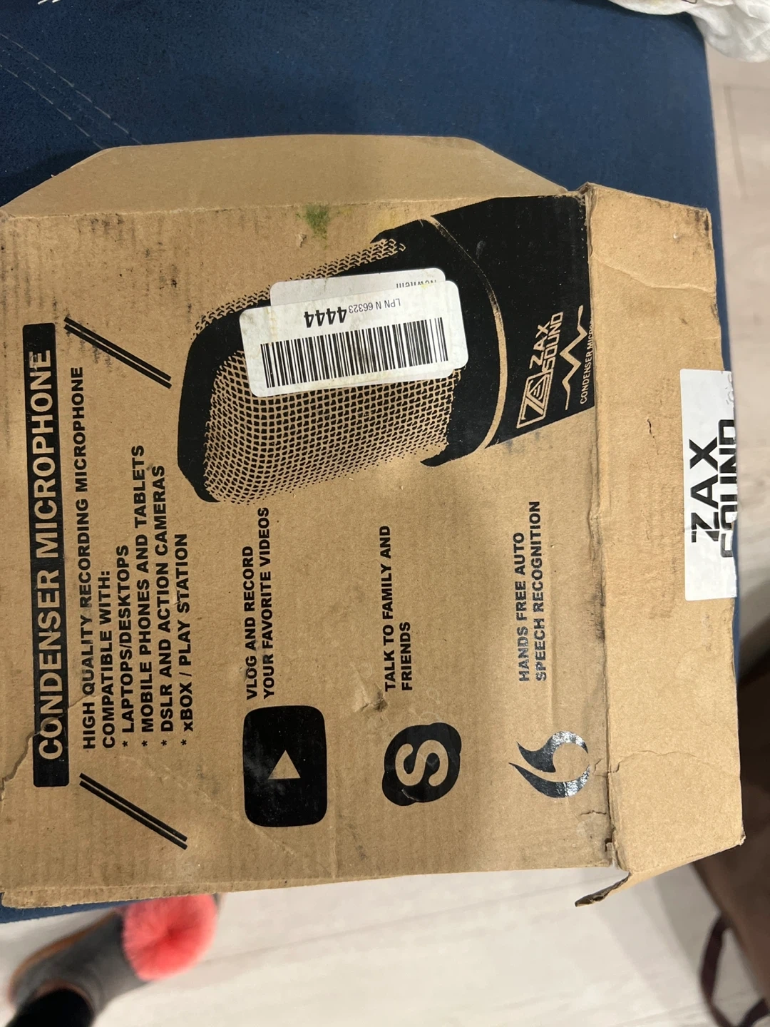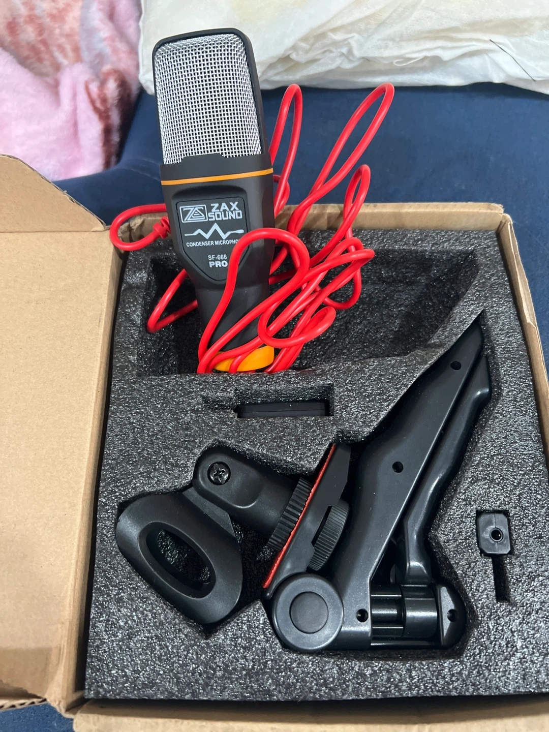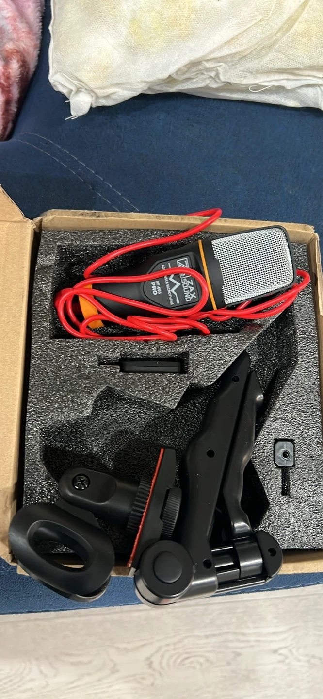 This is a ZAX SOUND SF-666 PRO condenser microphone. It's compatible with laptops, desktops, mobile phones, tablets, DSLR and action cameras, and Xbox/Play stations. Includes a mount and cable.
