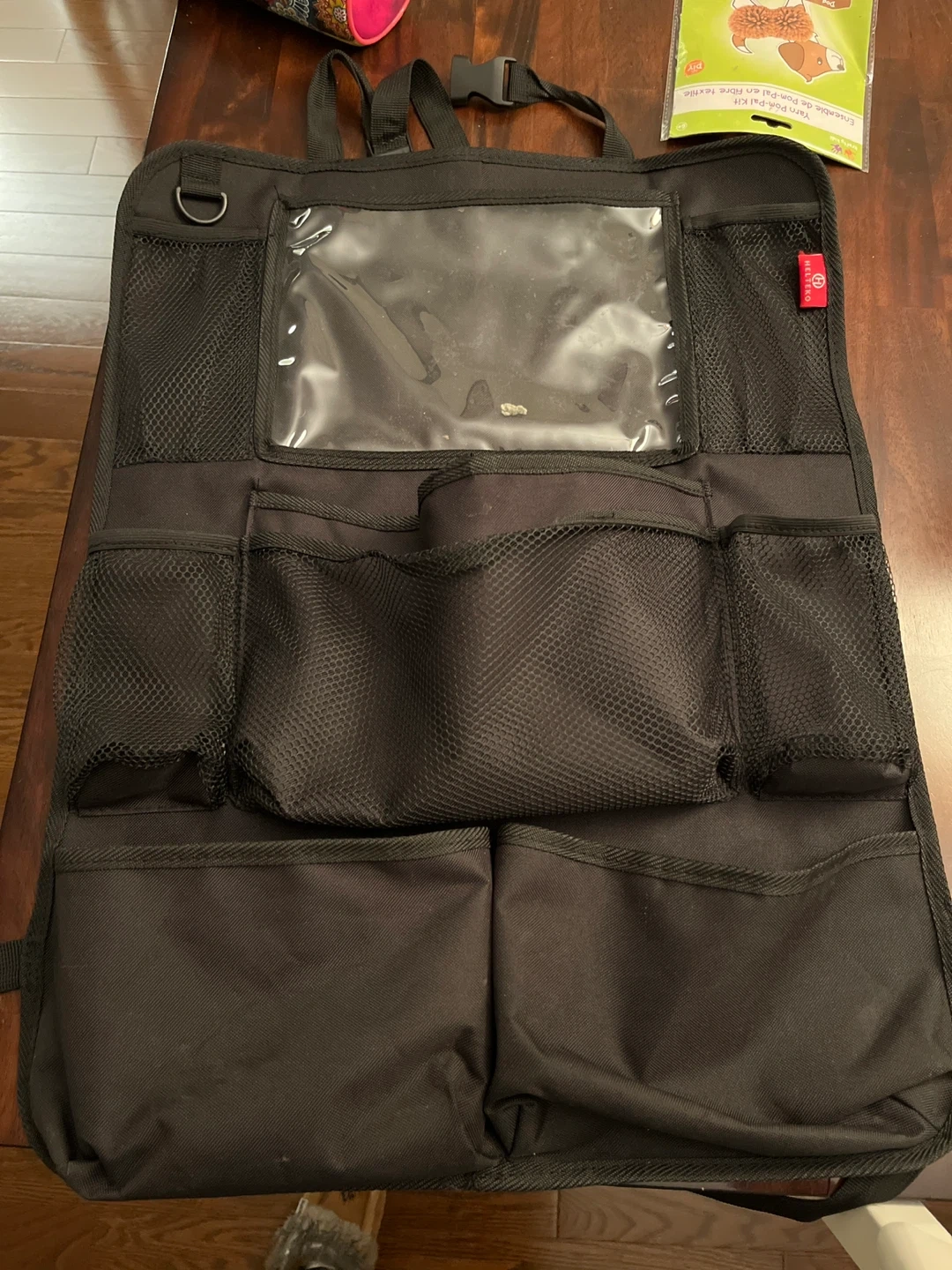 This black car seat organizer features multiple mesh and fabric pockets for storage. It has a clear touchscreen pocket and straps for hanging. It's made of durable fabric for long-lasting use.