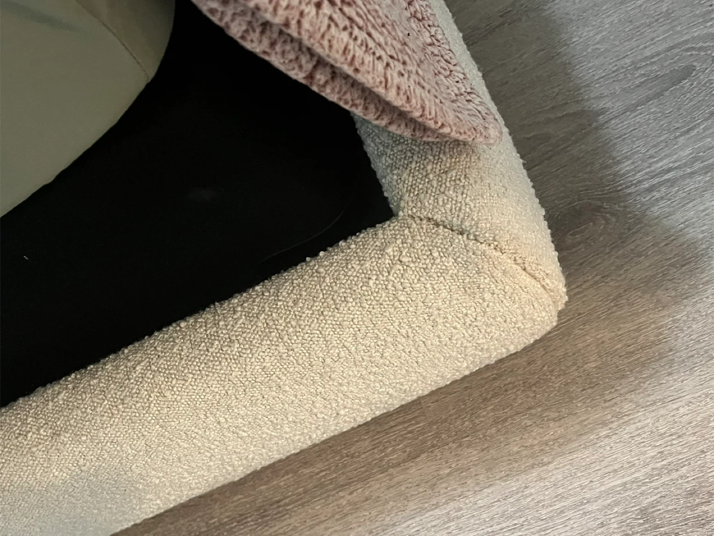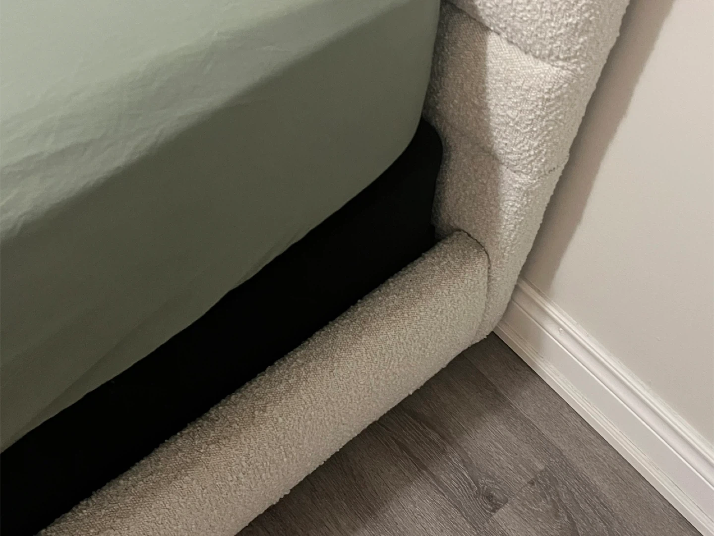 A stylish queen bed frame upholstered in boucle fabric. It's a great addition to any bedroom. Fabric is a light, neutral colour.