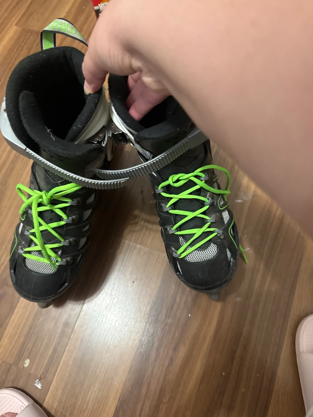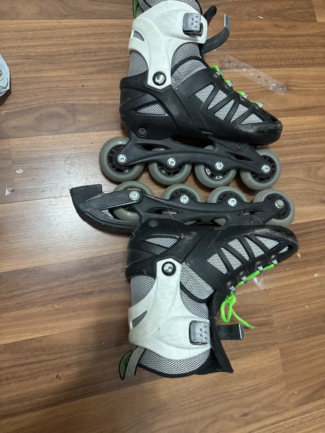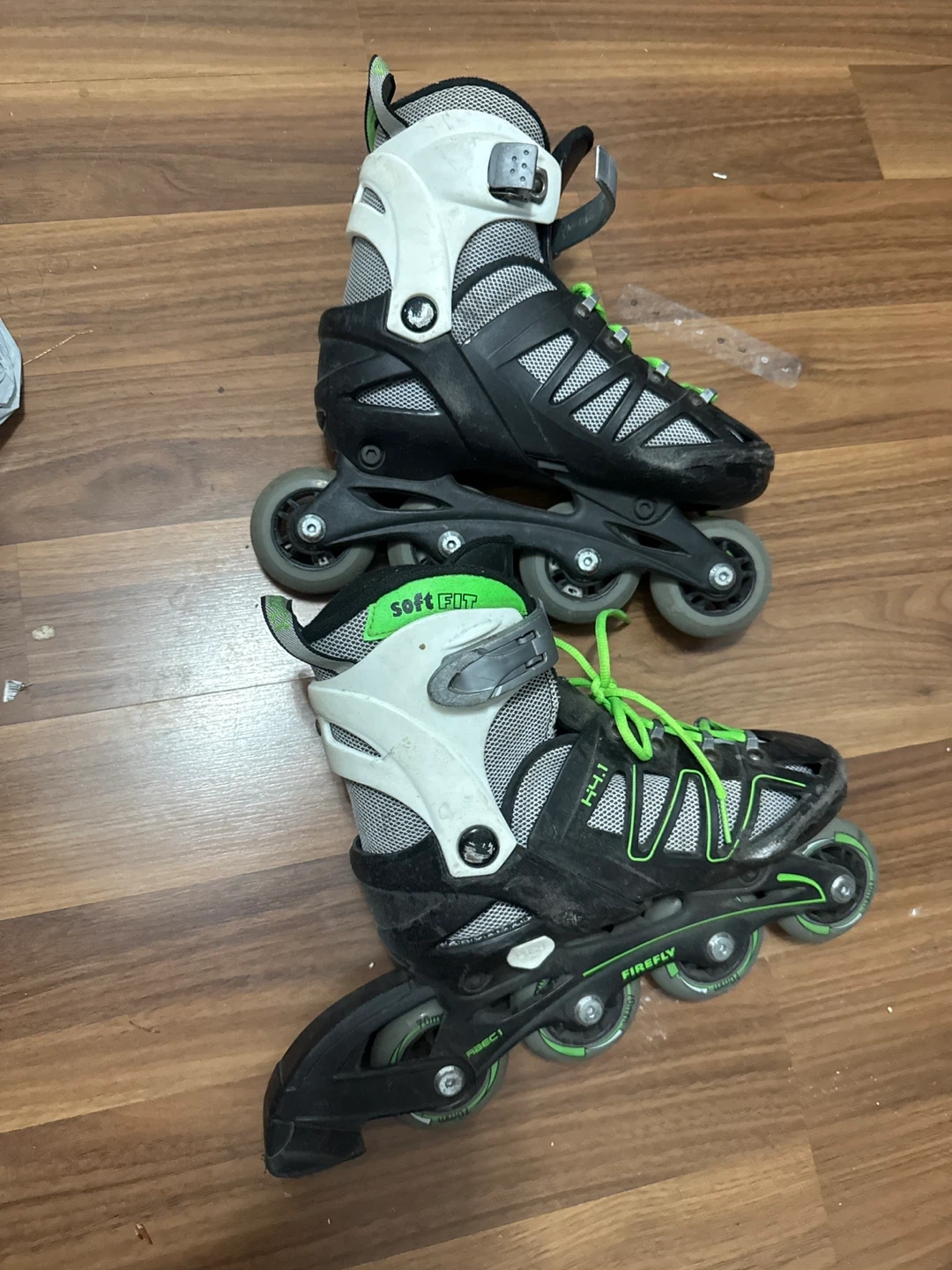 Pair of black and white Firefly inline skates with neon green laces. Adjustable buckle closure. Four wheels on each skate. Suitable for recreational skating.