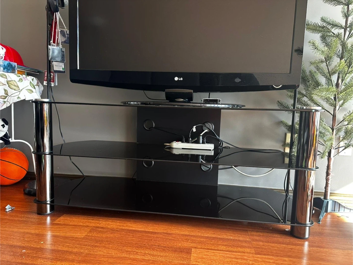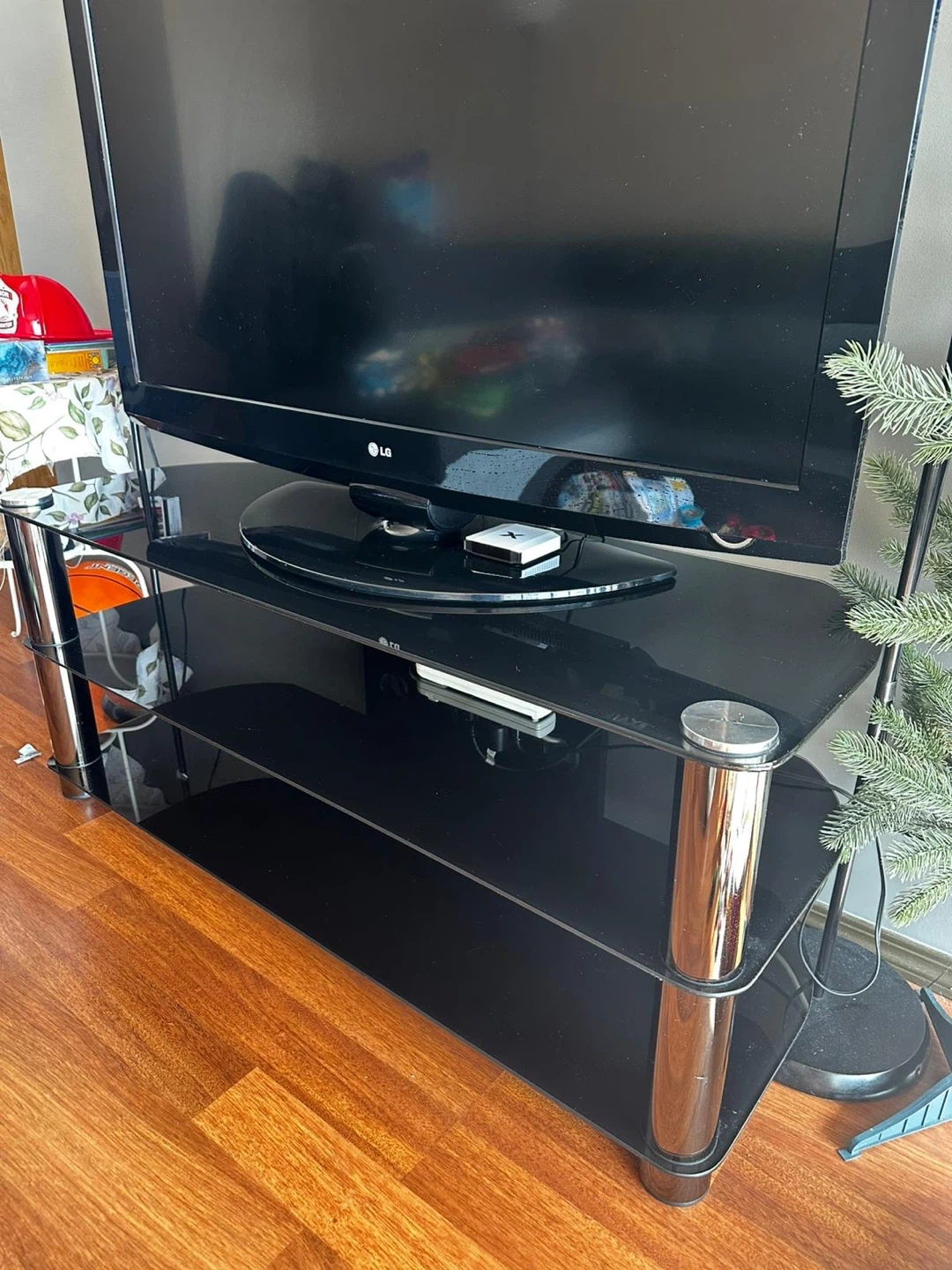 MOVING OUT SALE Black Glass TV Stand with Chrome Legs include TV