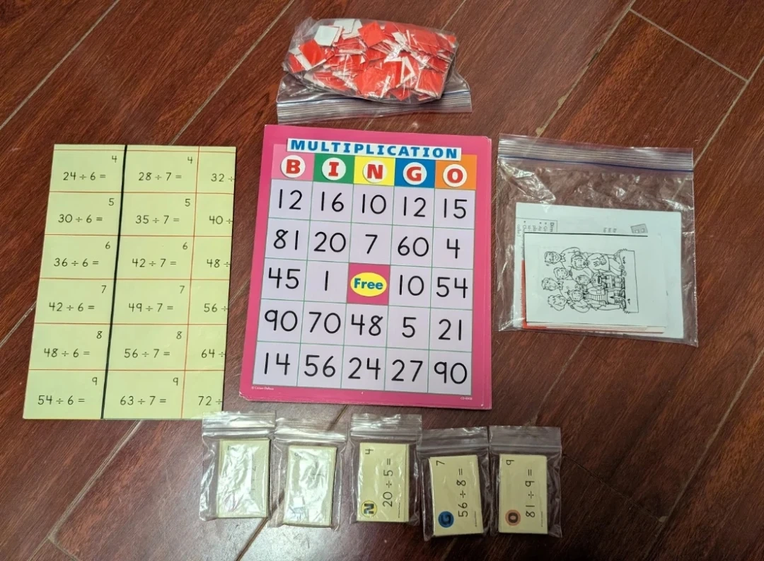 This educational game set includes boards and cards for both multiplication and division bingo. It's designed to help kids practice their math skills in a fun way. Cards and boards are included for both games.