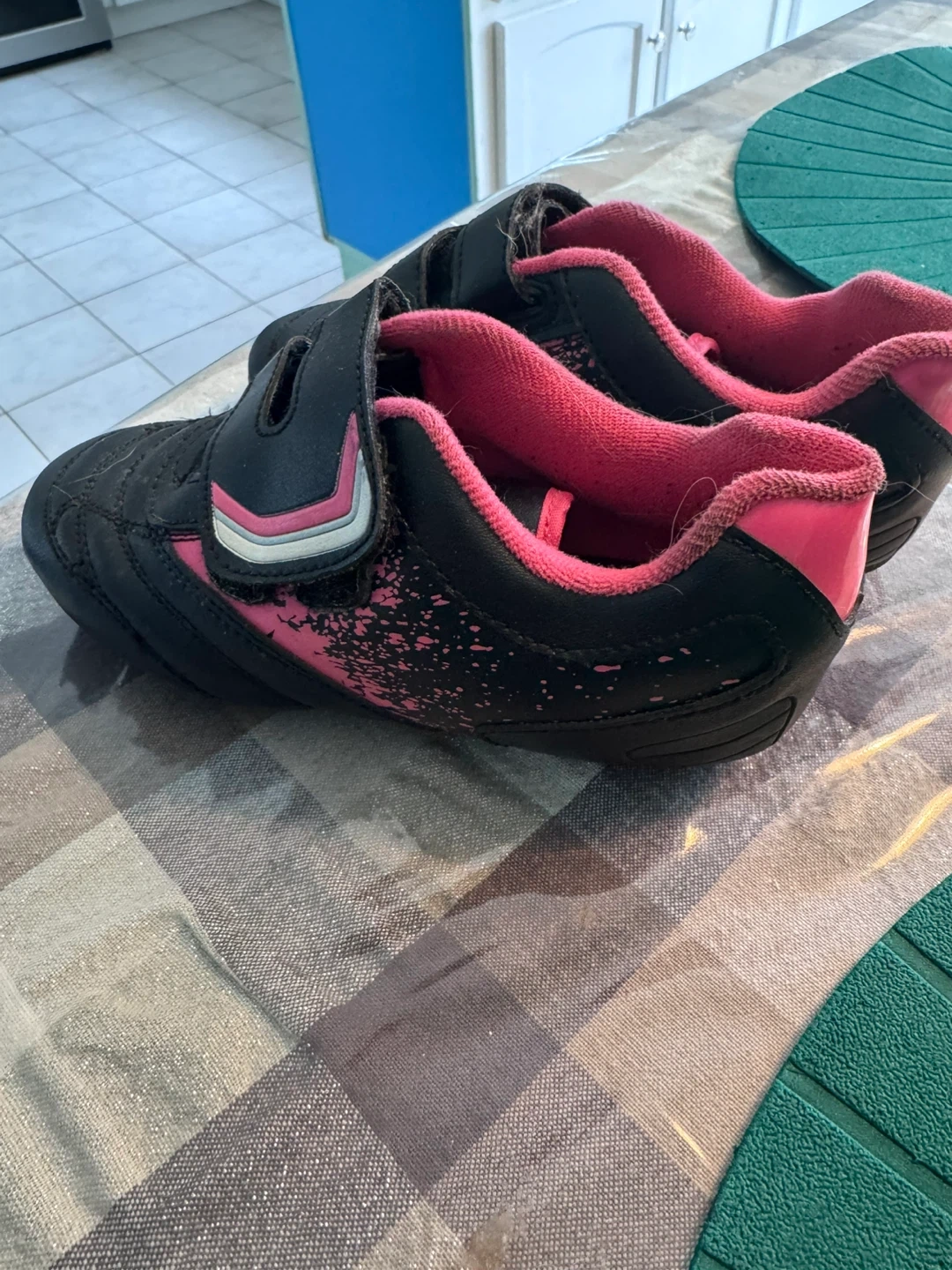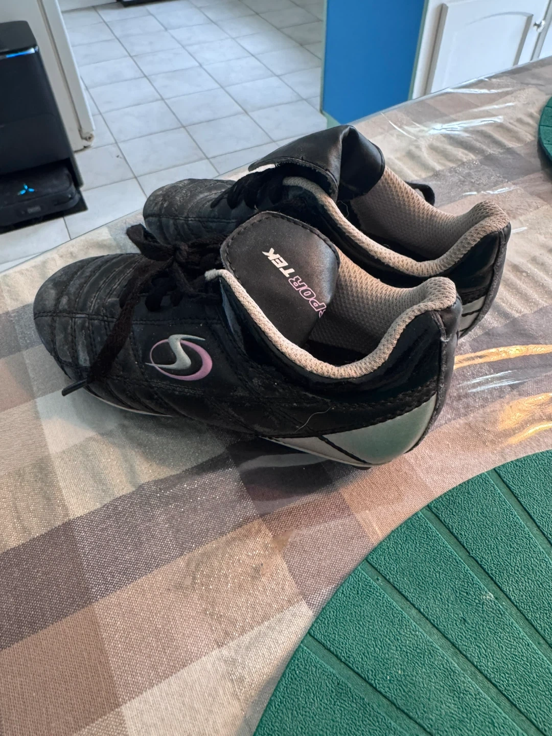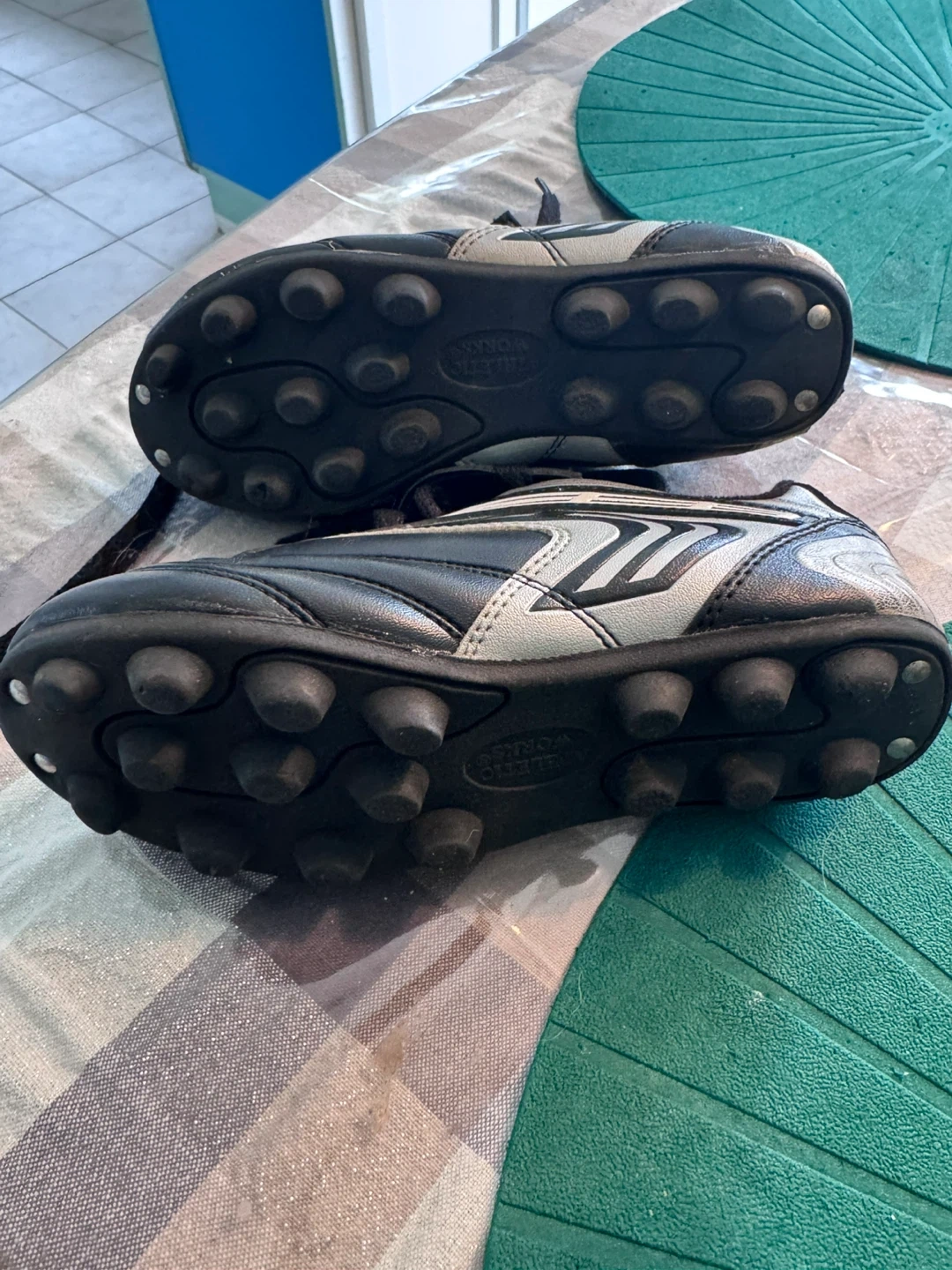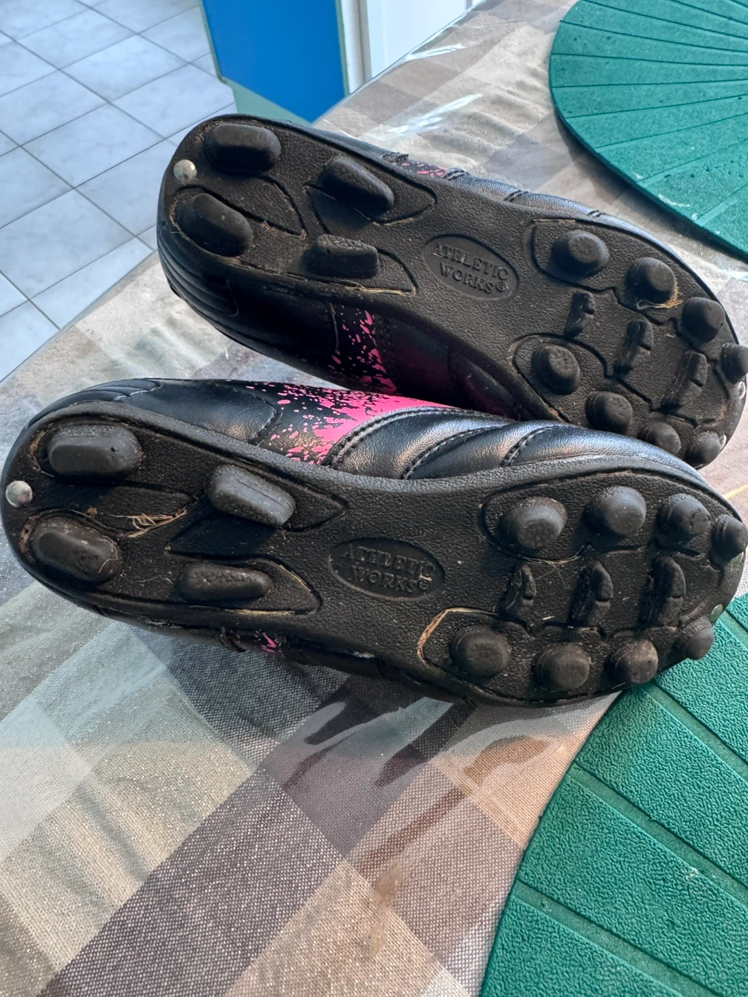 The black/grey/pink Sportek cleats and black/pink Athletic Works cleats are youth sized 12. The black and grey Athletic Works are youth sized 13. All in relatively good condition. Only worn for one season.