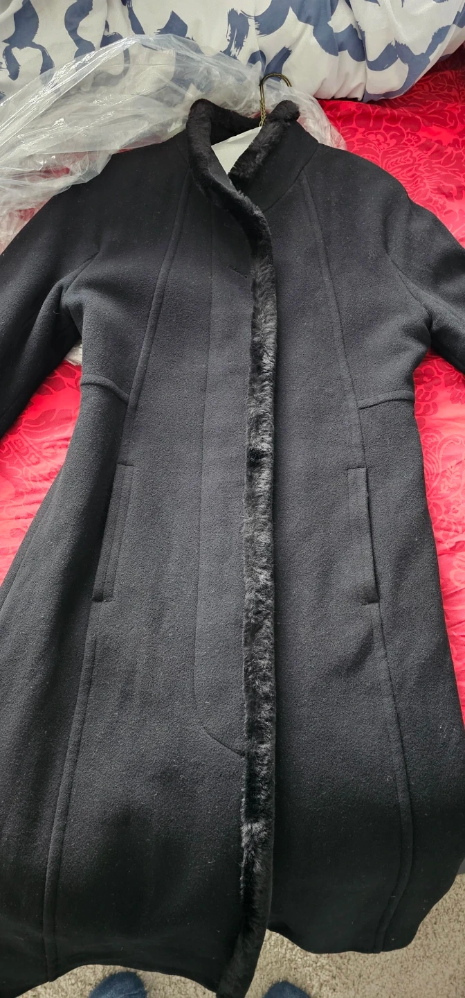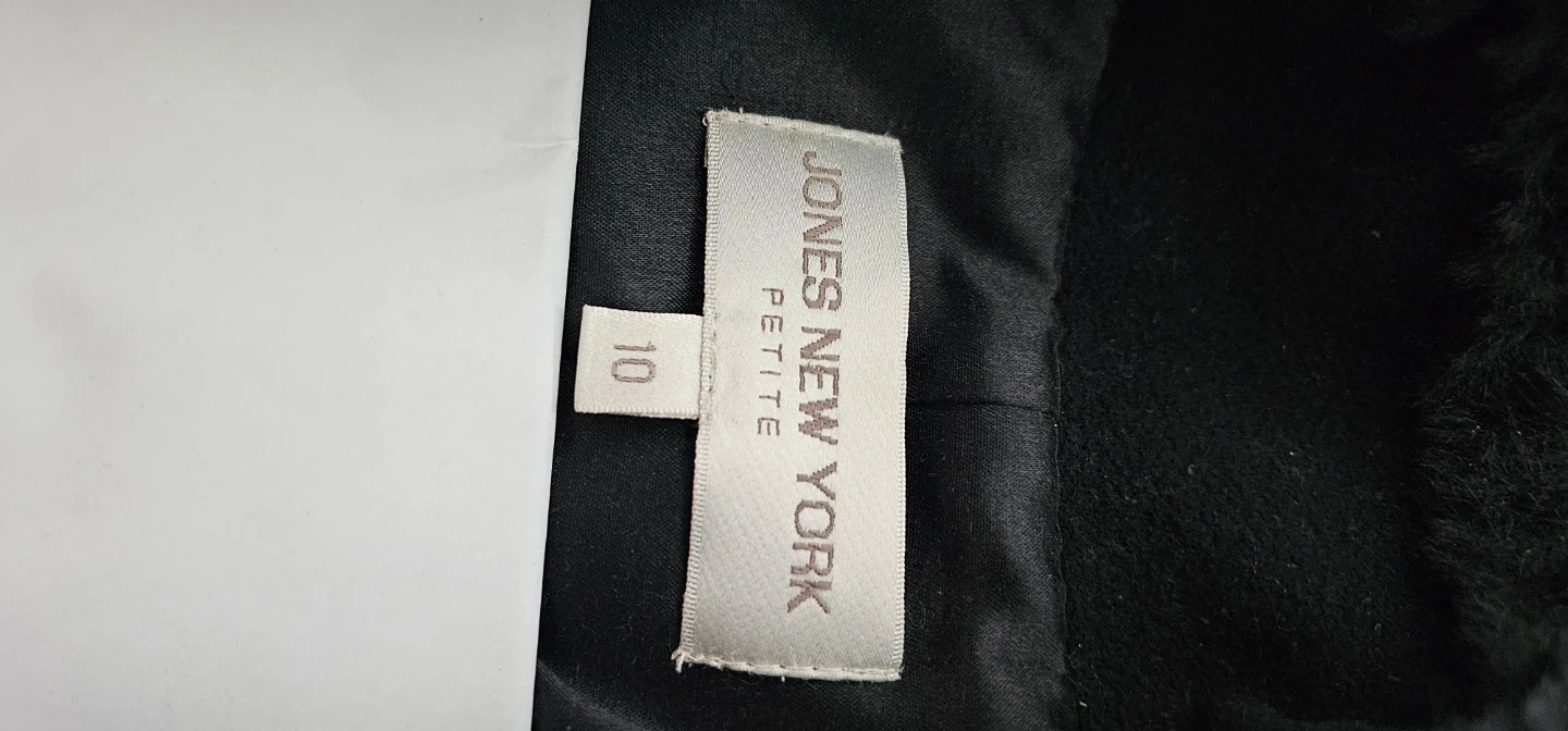 Here's a lovely Jones New York Petite coat in black! It's a size 10 and features a stylish design with faux fur trim. Perfect for keeping warm during the colder months!