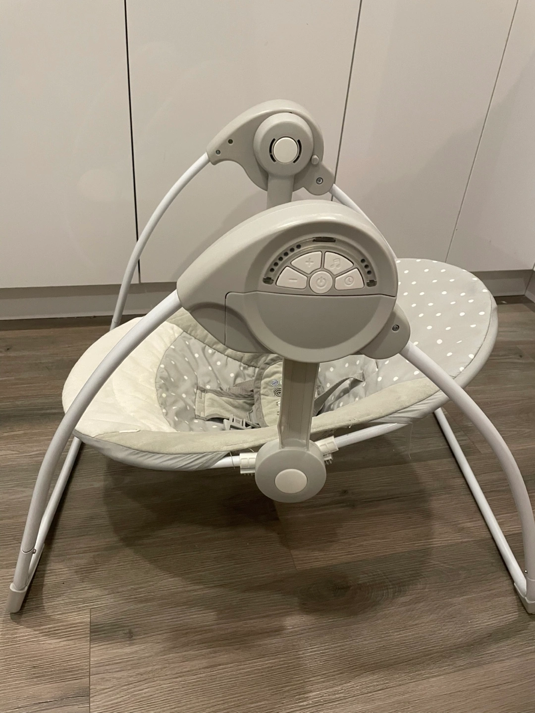 This Ingenuity baby swing features a grey and white polka dot pattern with a sheep accent. It's designed for infant comfort and portability. Includes multiple swing speeds and melodies.