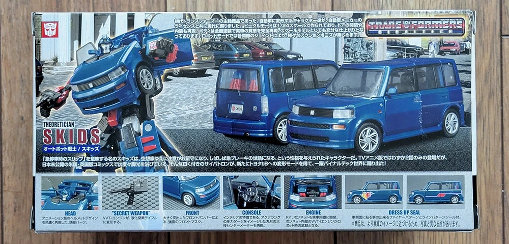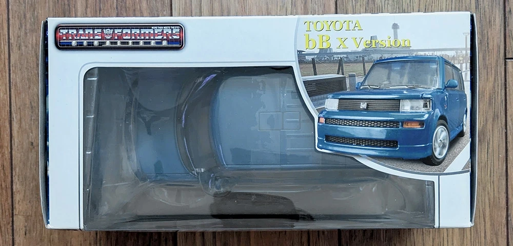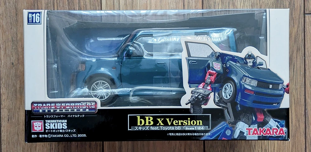 "Skids", BT-16, from the Transformers Binaltech line, brand new, factory sealed. Modelled after a blue Toyota bB X Version in 1:24 scale.
