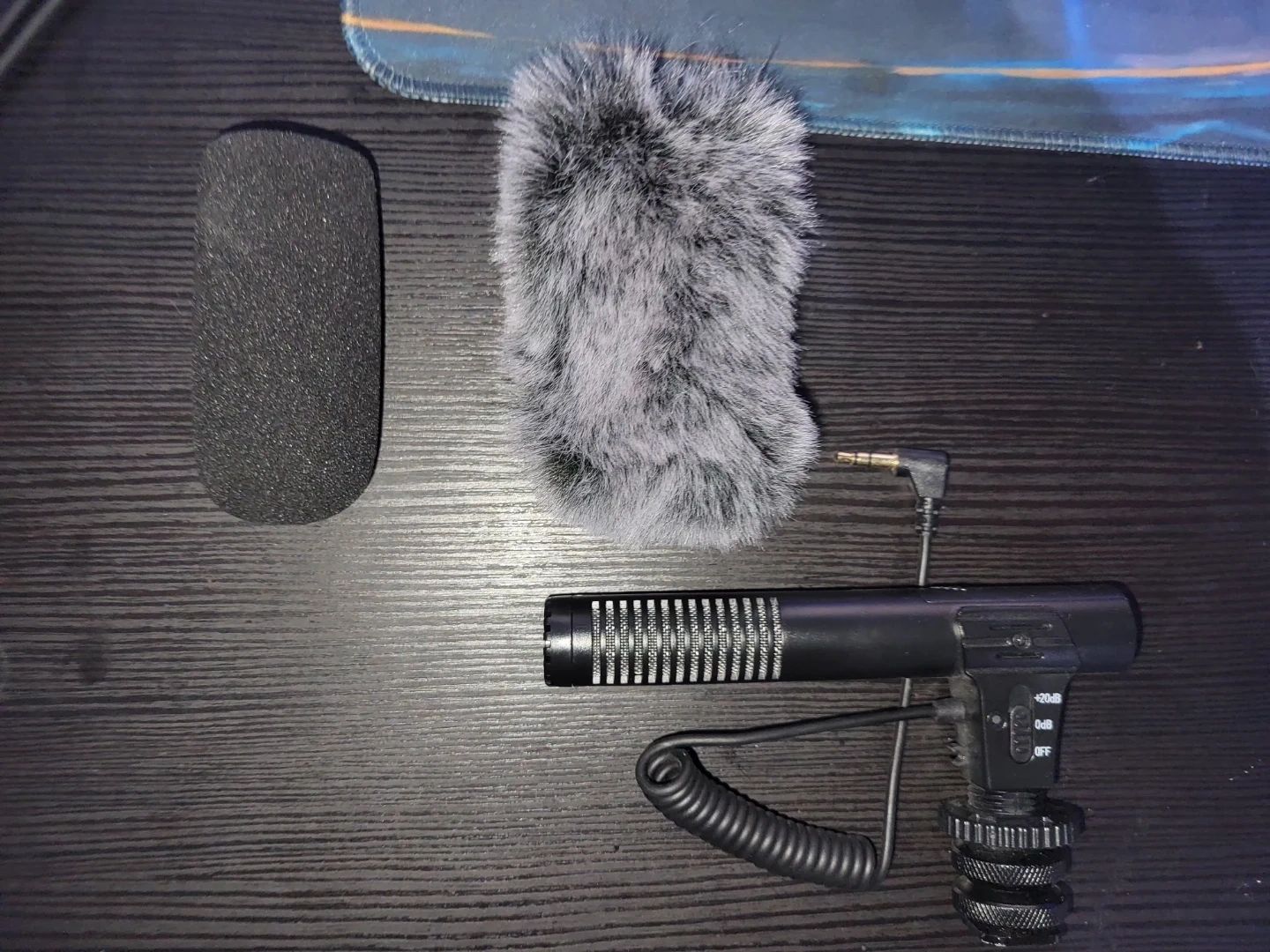 Complete shotgun microphone setup. Has the mic, a foam cover, and a furry wind muff for clear audio. Comes with a coiled cable that has a 3.5mm jack. Mic has switches for -20dB, 0dB, and OFF. Super handy for recording stuff.