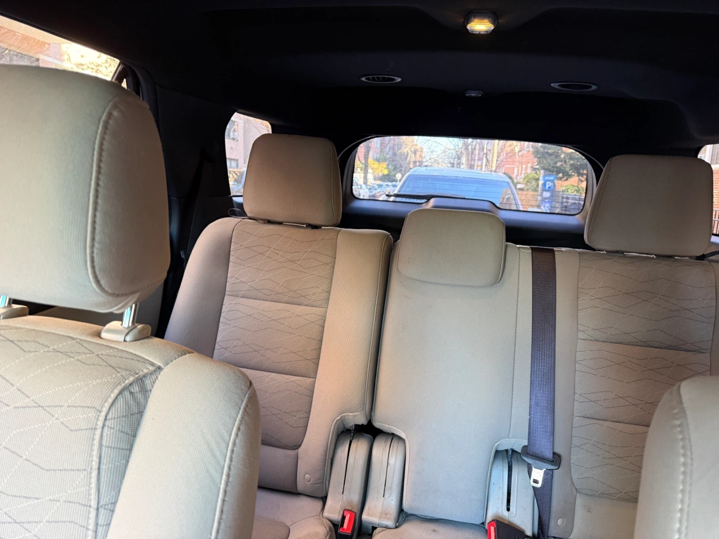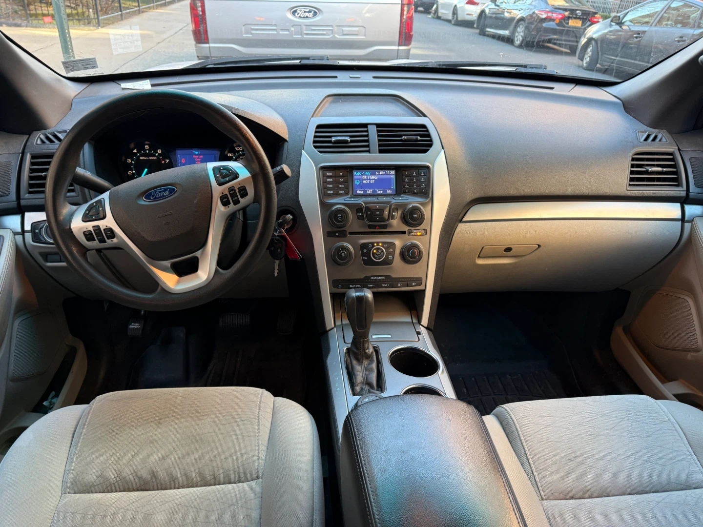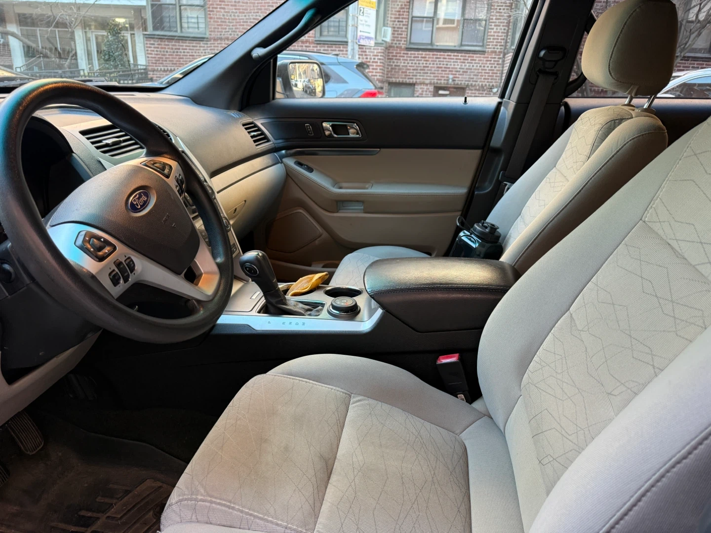 White Ford Explorer SUV with cloth interior. Comes with a leather-wrapped center console armrest. Perfect for families needing extra space.