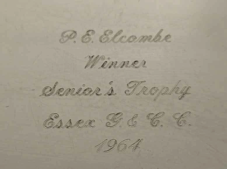Silver (assumed plated, no markings) candy dish with lid. This was a Golf award to the Champion in 1964. Inscription reads: P.E Elcombe WINNER Seniors Trophy Essex G & C C 1964. Decent size at 11 3/8 wide, 9" across, and 3.5 inches tall. Listed as used, like new, as there is only 1 small dent in this piece. Nice 61-year-old dish. Asking $50 or best offer, reduced to $30.