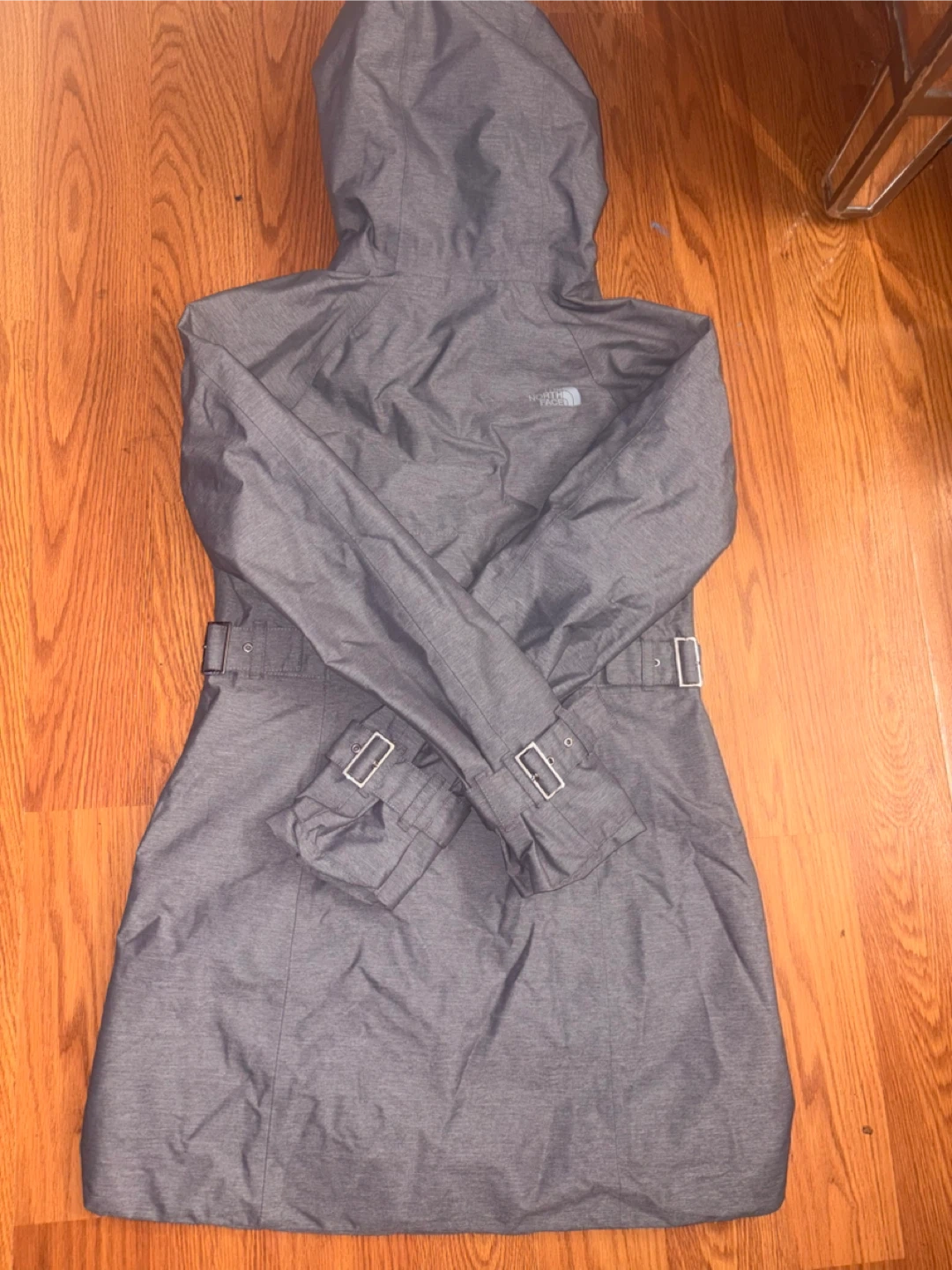 Selling a The North Face women's rain jacket in size XS. It is in good condition and perfect for rainy days. The jacket features a hood and a belted design. Size runs big