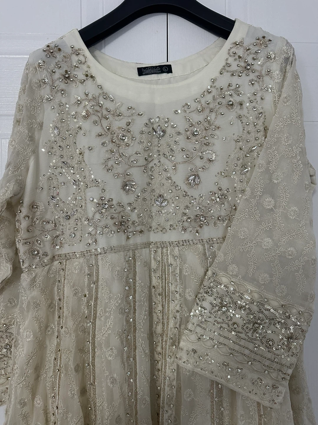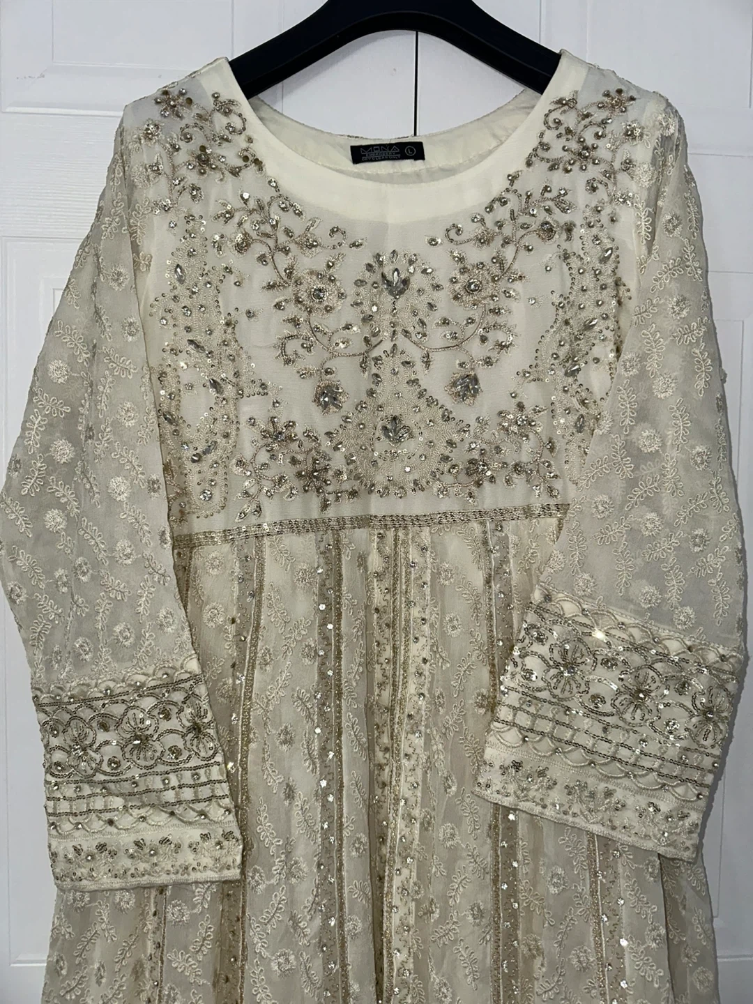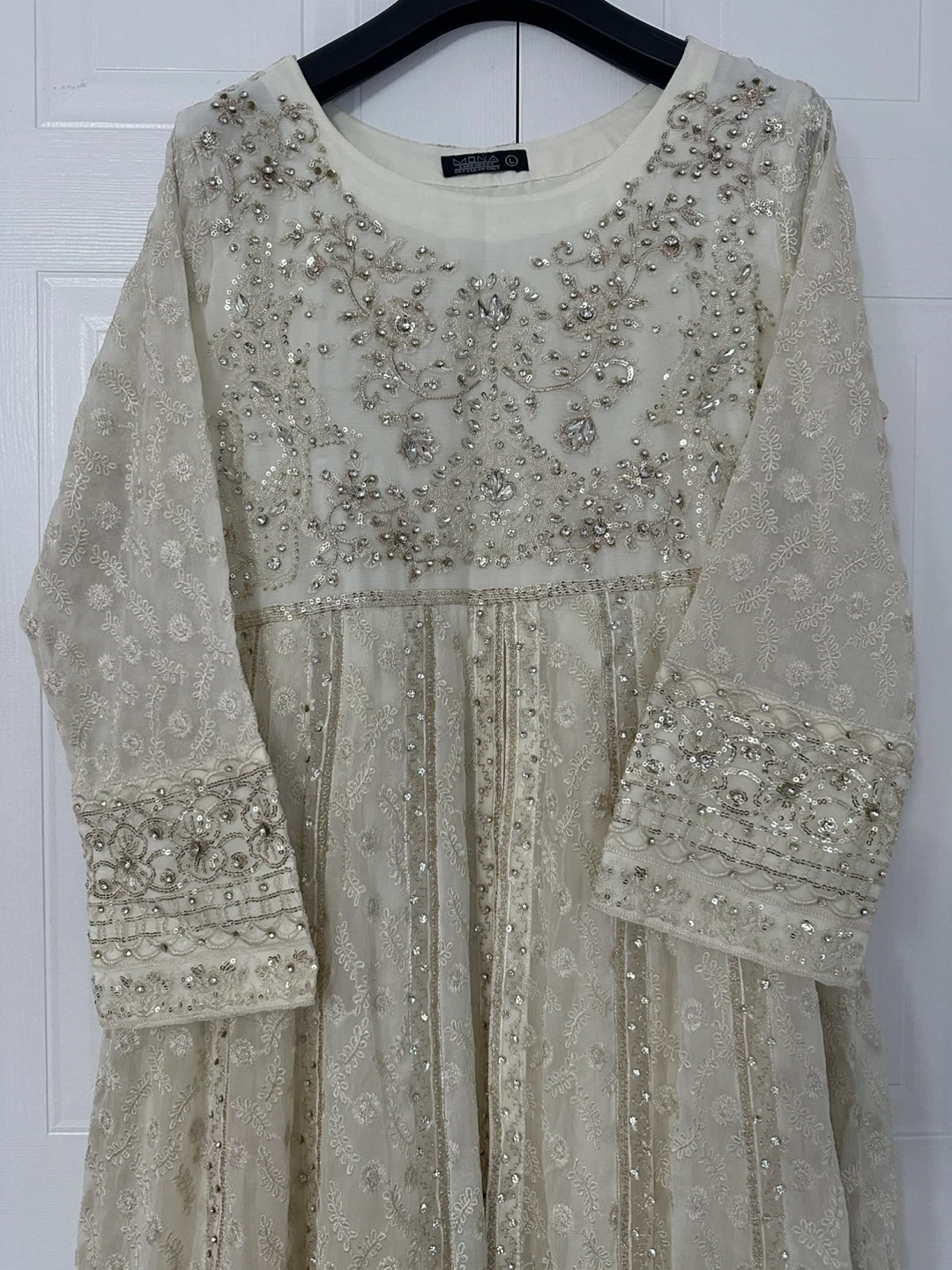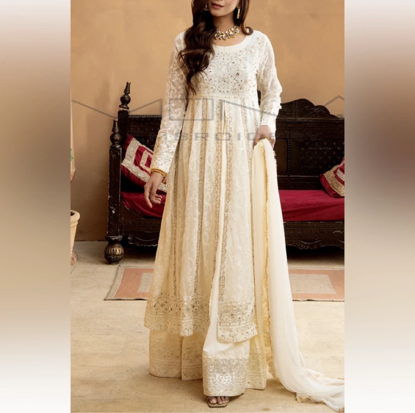 Exquisite white long gown, embellished with meticulously crafted stone embroidery, evoking an aura of timeless beauty. Paired with an ethereal chiffon dupatta delicately accented with intricate kiran lace trim, and embroidered trousers, this ensemble excudes grace and charm, making it the perfect choice for any formal affair.
