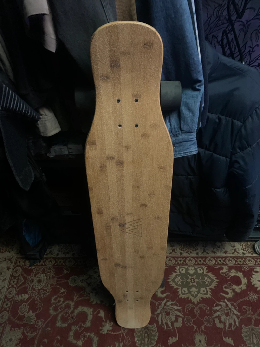 This is a Magneto longboard skateboard. It's made of bamboo and has a classic shape. Perfect for cruising around town, just don’t ride as much.