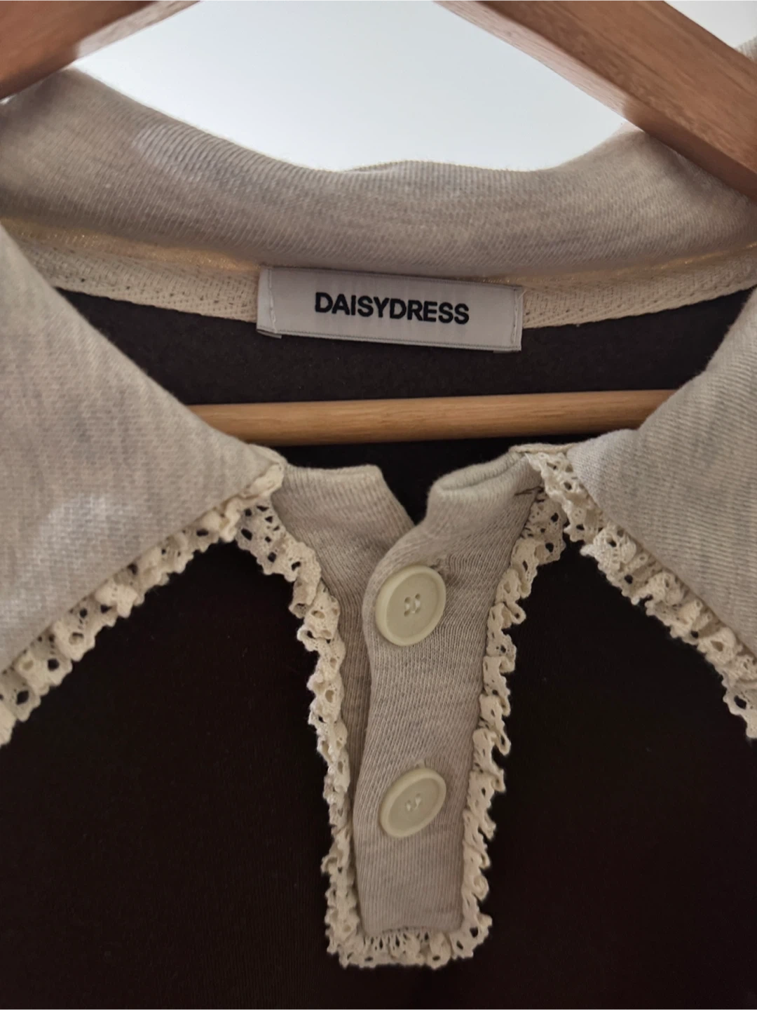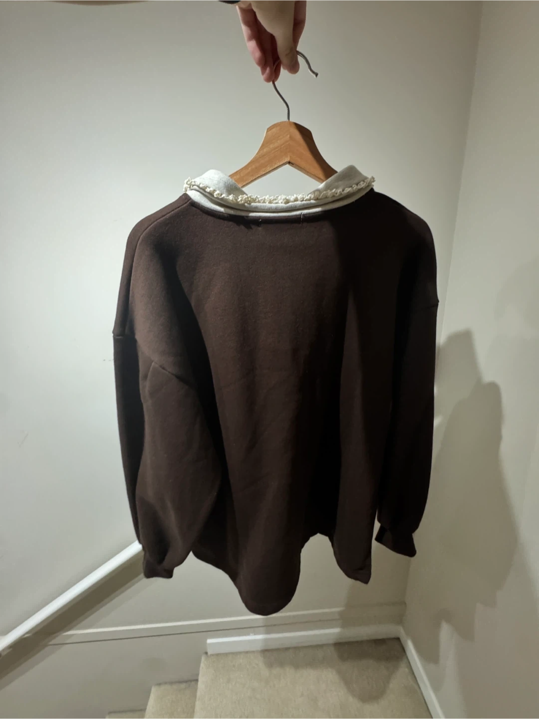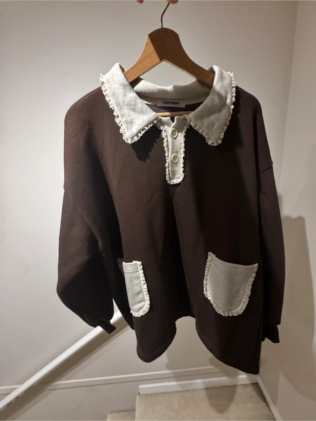 10Selling a DAISYDRESS sweatshirt with a cute collar! It's a brown colour with a beige collar and lace detailing. It has two pockets on the front as well’s Length: ~62 cm Chest: ~120cm Pick up in Richmond