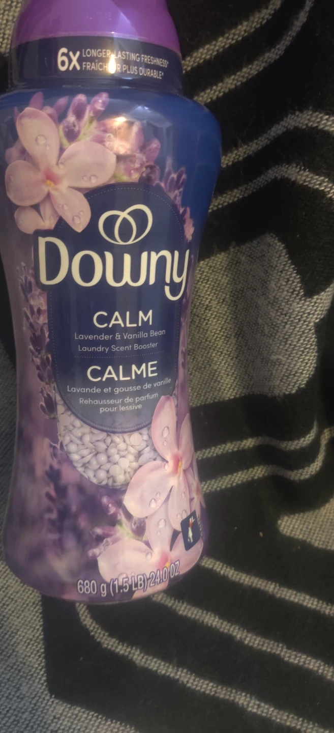 Downy Calm laundry scent booster beads in Lavender & Vanilla Bean. Provides 6x longer-lasting freshness. 680 g (1.5 lb) bottle.